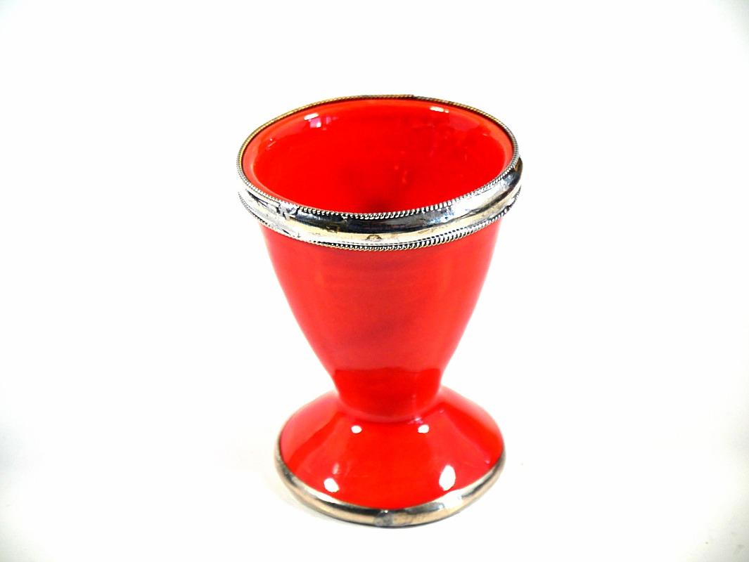 Coquetier artisanal en poterie, en provenance de Marrakech (Maroc), peint en orange, émaillé, et cerclé de métal ornemental argenté, légèrement ciselé.