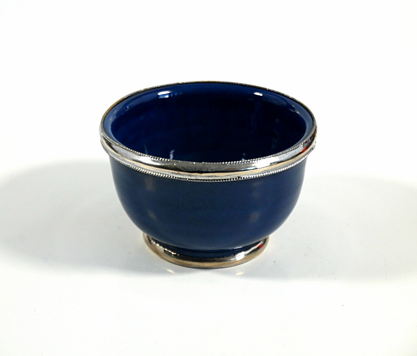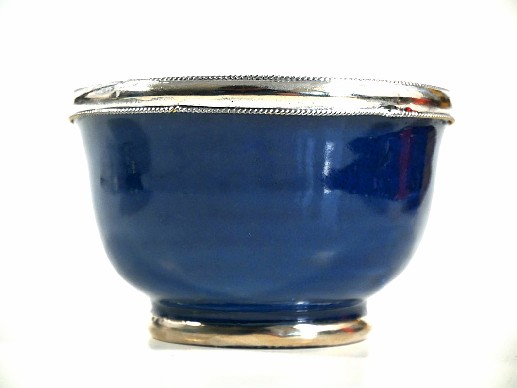 Joli récipient bleu pétrole, de taille petite, en poterie, de provenance de Marrakech (Maroc), émaillé et cerclé de métal ornemental argenté légèrement ciselé.