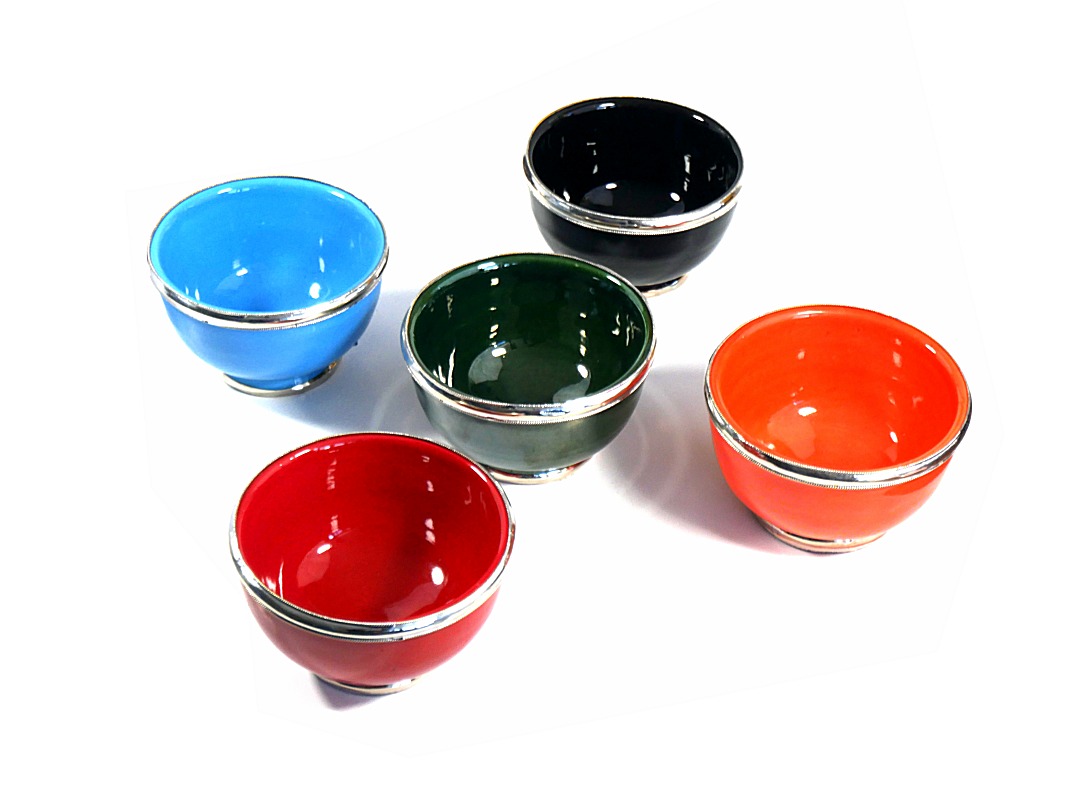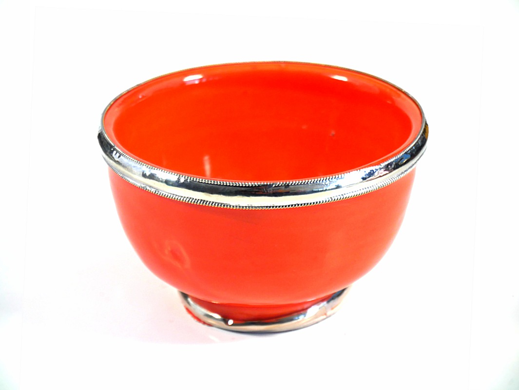 Bol moyen en poterie marocain de couleur orange emaille et cercle de metal argente