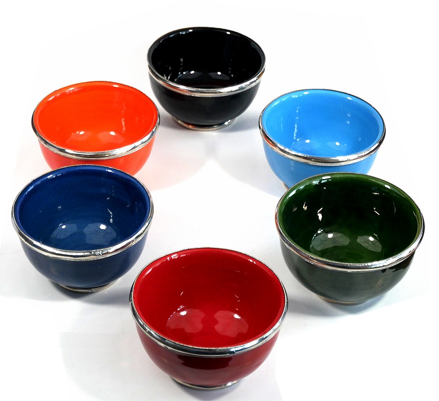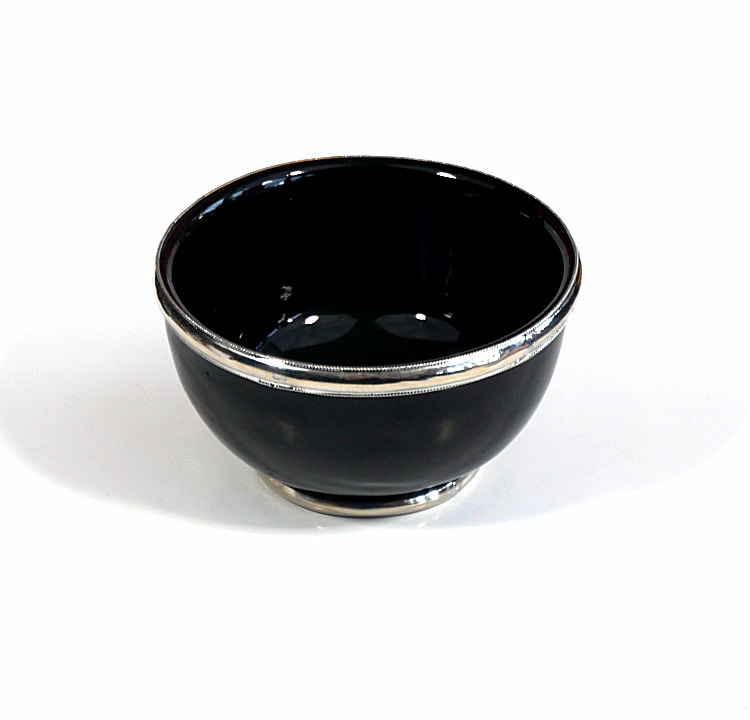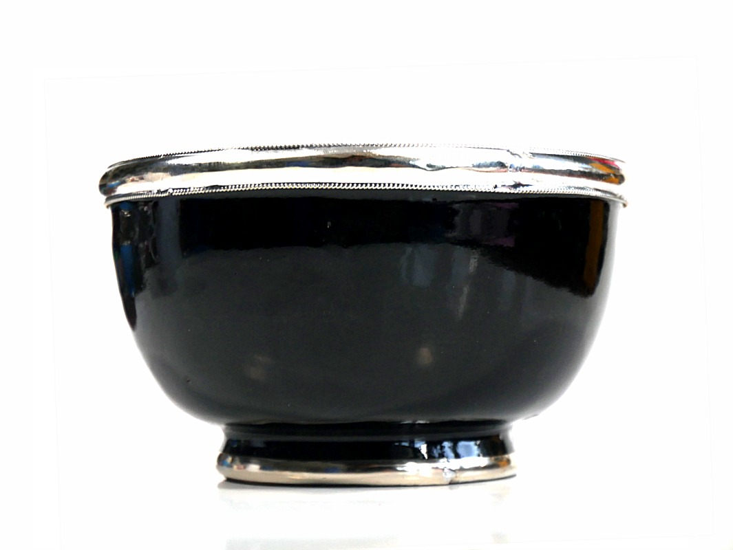 Bol moyen en poterie marocain de couleur noir émaillé et cerclé de métal argenté
