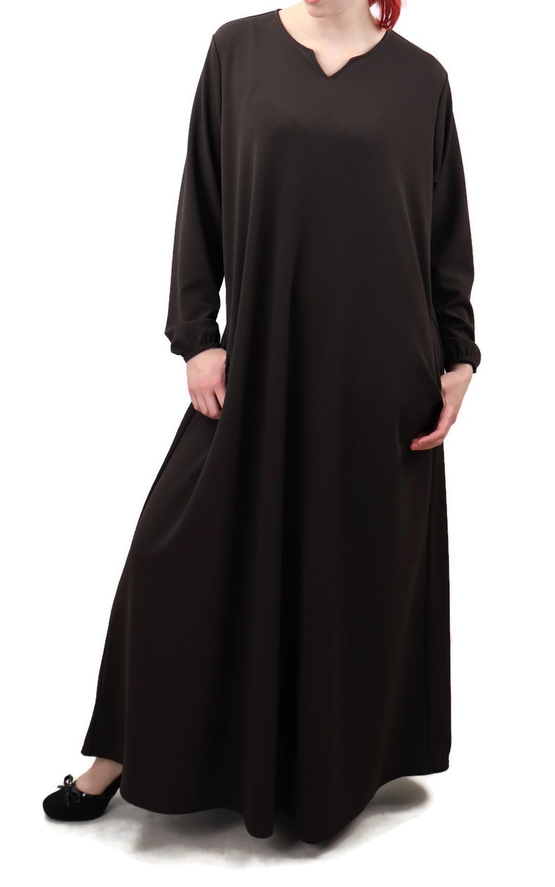 Robe évasée col v, tissu épais non transparent légèrement extensible, manches élastiques. Deux poches.
