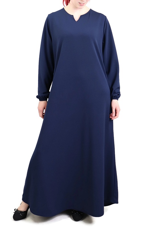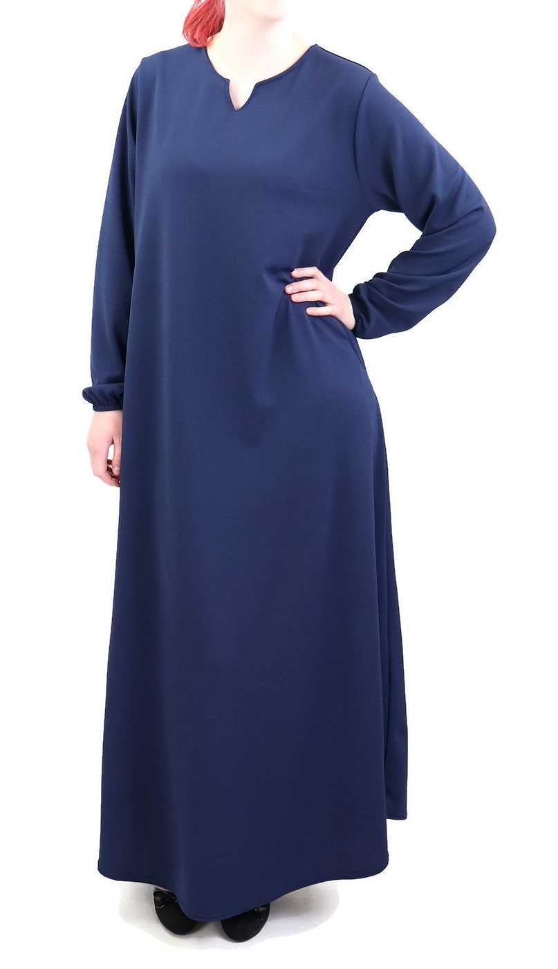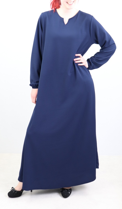 Robe évasée col en V, tissu épais non transparent légèrement extensible, poignets élastiques. Deux poches latérales.