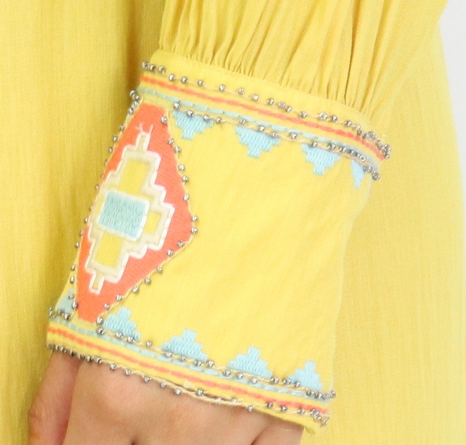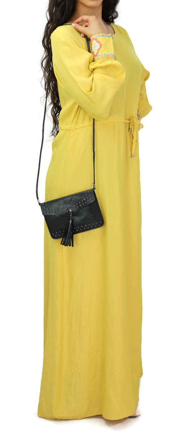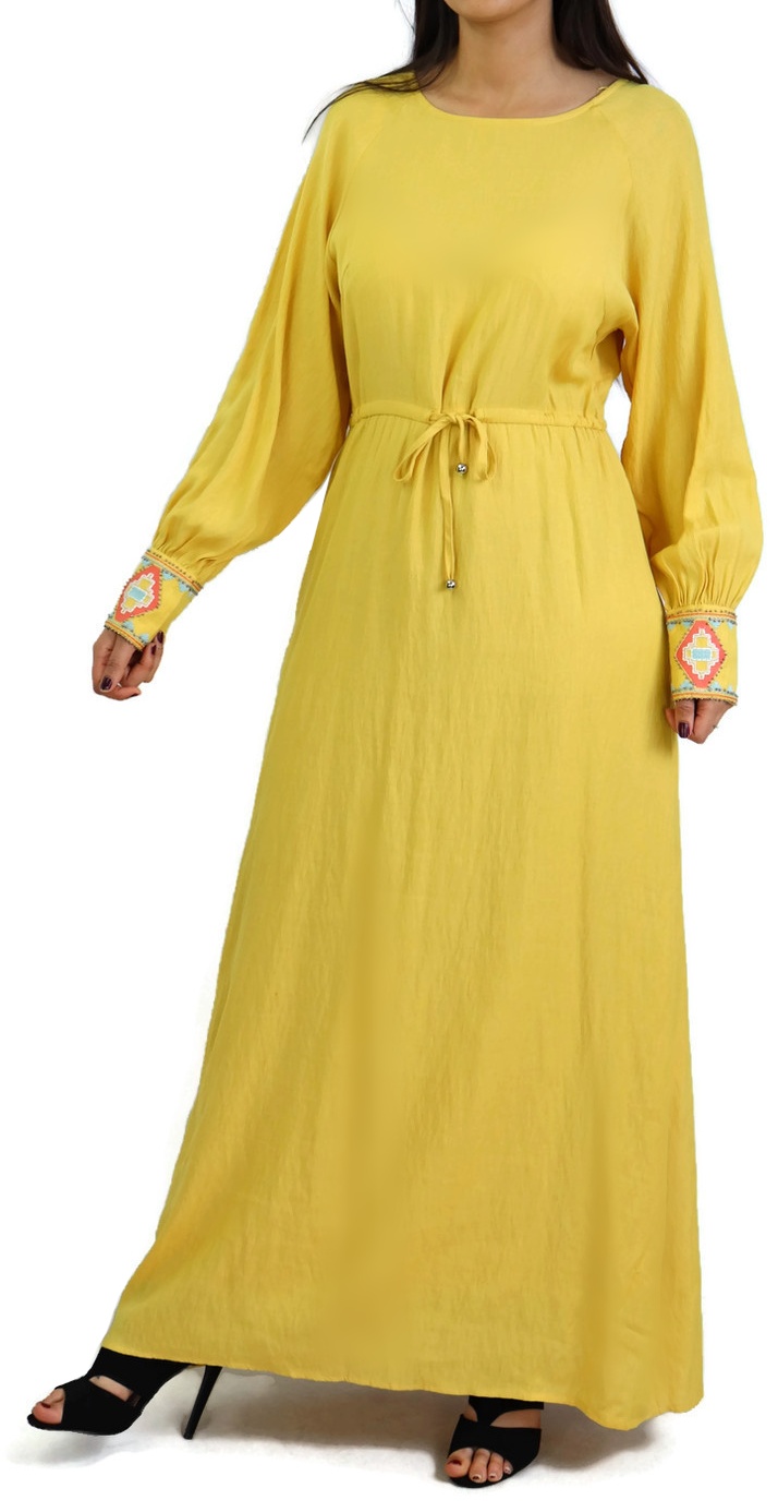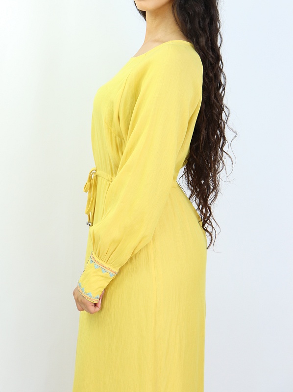 Robe longue jaune avec ceinture integree et broderies au niveau des manches