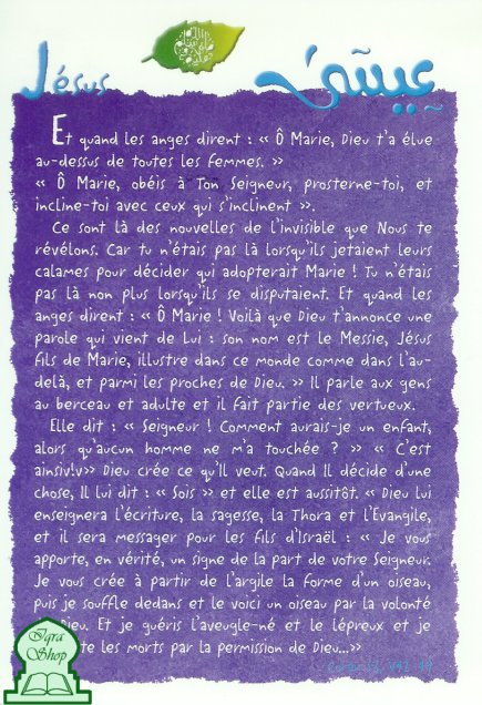 Et quand les Anges dirent : "Ô Marie, Dieu t'a élue au dessus de toutes les femmes". "Ô Marie, obéis à ton Seigneur, prosterne-toi, et incline-toi avec ceux qui s'inclinent". Ce sont là des nouvelles de l'Invisible que Nous te révélons. Car tu n'étais pas là lorsqu'ils jetaient leurs calames pour décider qui adopterait Marie!... (Sourate 3 Al-Imran Versets 42 à 49).