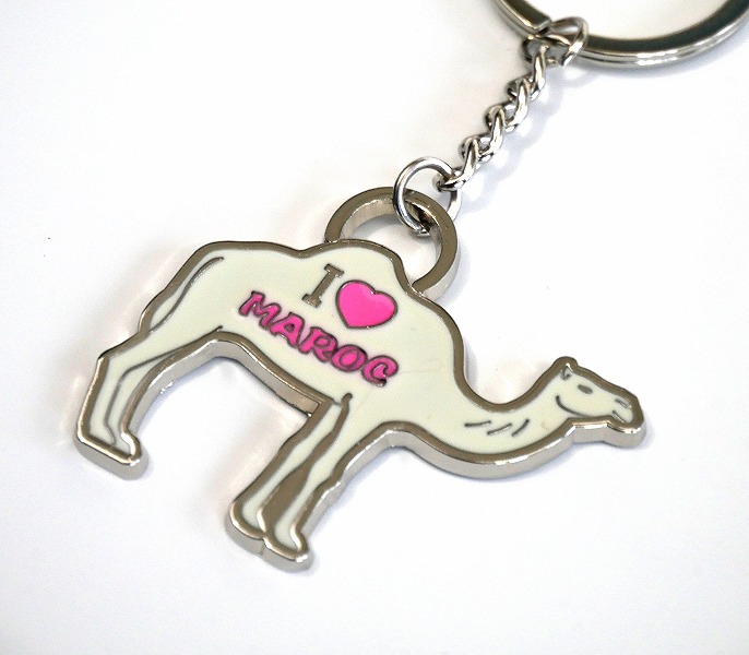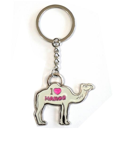 Porte clé en métal argenté sous forme de chameau avec inscription J'aime le Maroc...