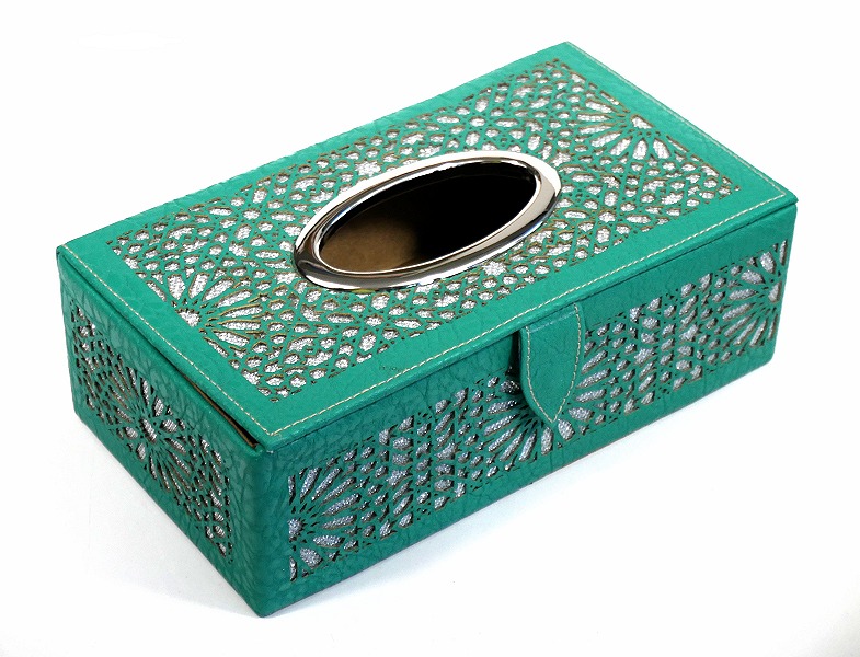Boite a mouchoirs decorative en cuir de fabrication artisanale marocaine de couleur vert-bleu