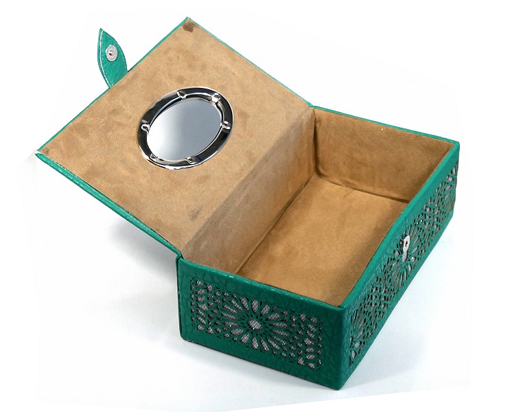 Boîte à mouchoirs décorative en cuir de fabrication artisanale marocaine de couleur vert-bleu - REF. 29439 (19.90 €)