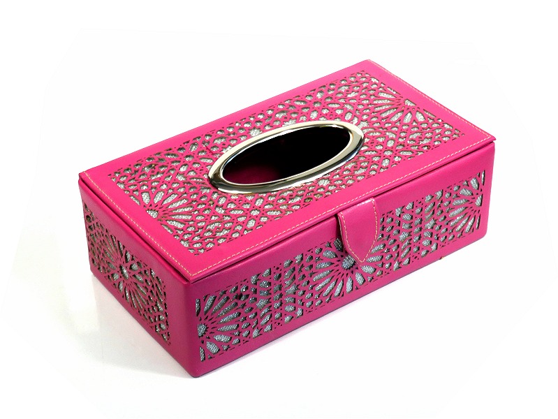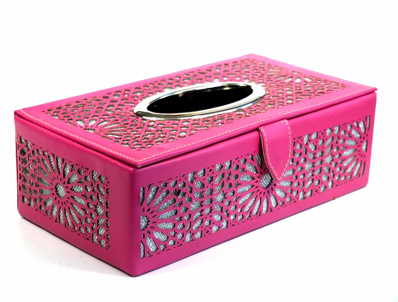 Boîte à mouchoirs décorative en cuir de fabrication artisanale marocaine de couleur rose Deco & Cadeau