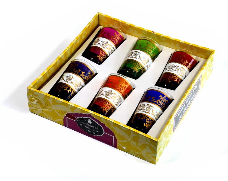Verres à thé marocain colorés et ornés de motifs traditionnels dorés (Pack de 6 verres) - REF. 29476 (15.00 €)