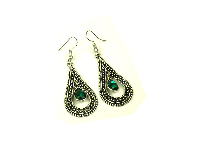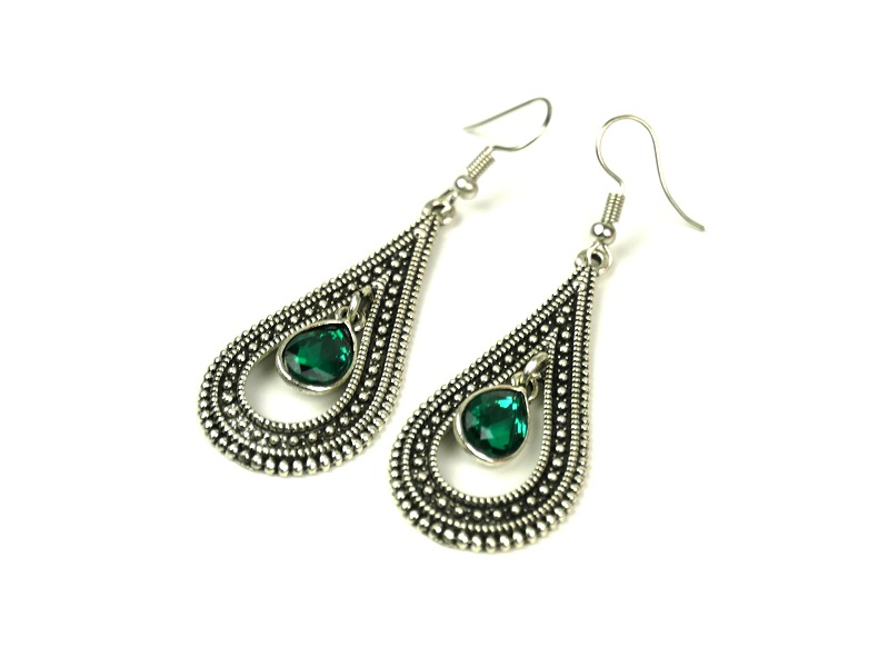 Boucles d'oreilles pendantes en métal argenté ciselé serties de pierres vert Vetement & Accessoire
