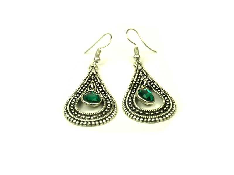 Boucles d'oreilles pendantes, style berbère, fabriquées en métal argenté - composition argent - délicatement ciselé, serties de pierres vert.