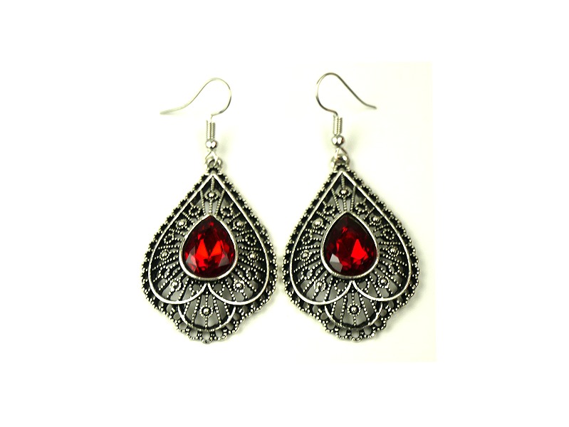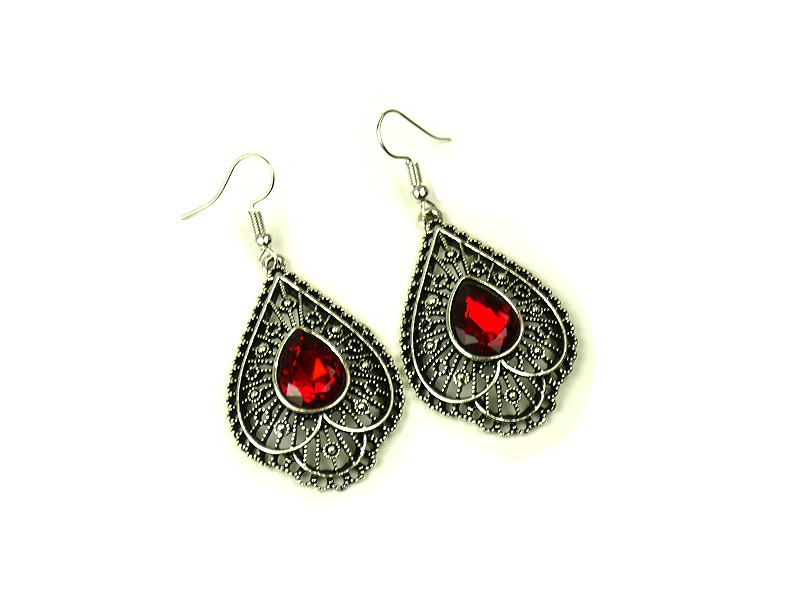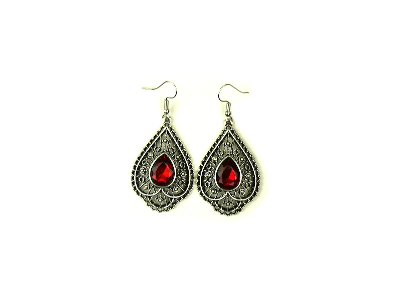 Boucles d'oreilles pendantes, style berbère, fabriquées en métal argenté - composition argent - délicatement ciselé, serties de pierres rouge.