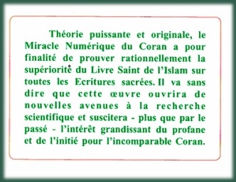 Théorie puissante et originale, le MIRACLE Numérique du Coran a pour finalité de prouver rationnellement la supériorité du Livre Saint de l'Islam sur toutes les Ecritures sacrées. Il va sans dire que cette œuvre ouvrira de nouvelles avenues à la recherche scientifique et suscitera - plus que par le passé - l'intérêt grandissant du profane et de l'initié pour l'incomparable Coran