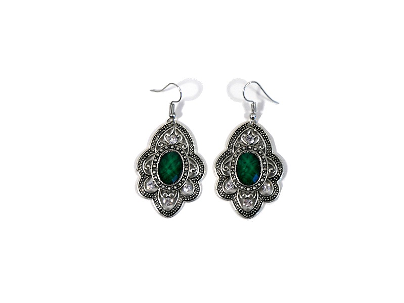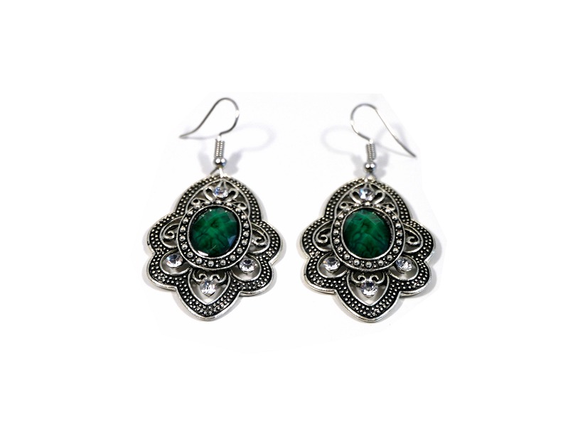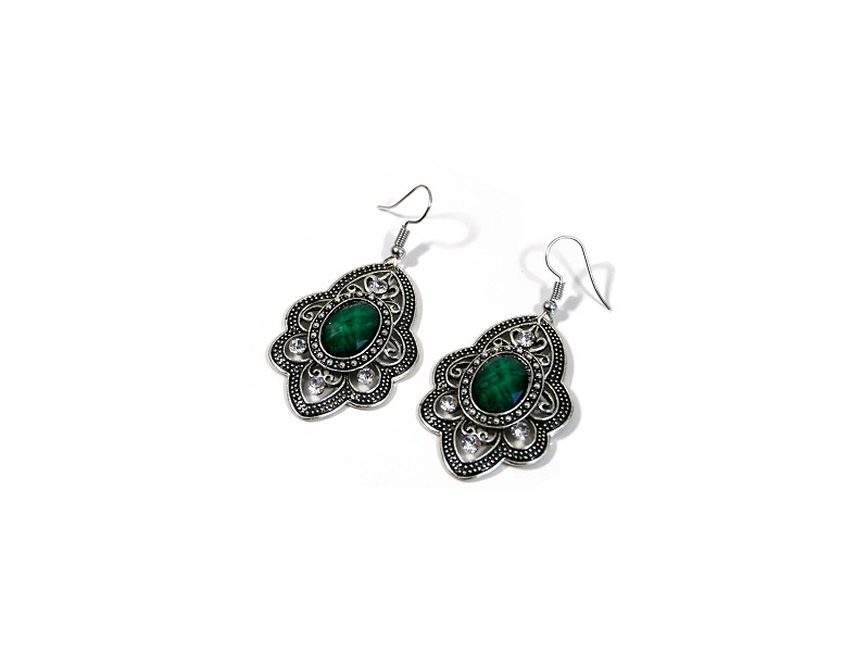Boucles d'oreilles pendantes, style berbère, fabriquées en métal argenté - composition argent - délicatement ciselé, serties de pierres vert.