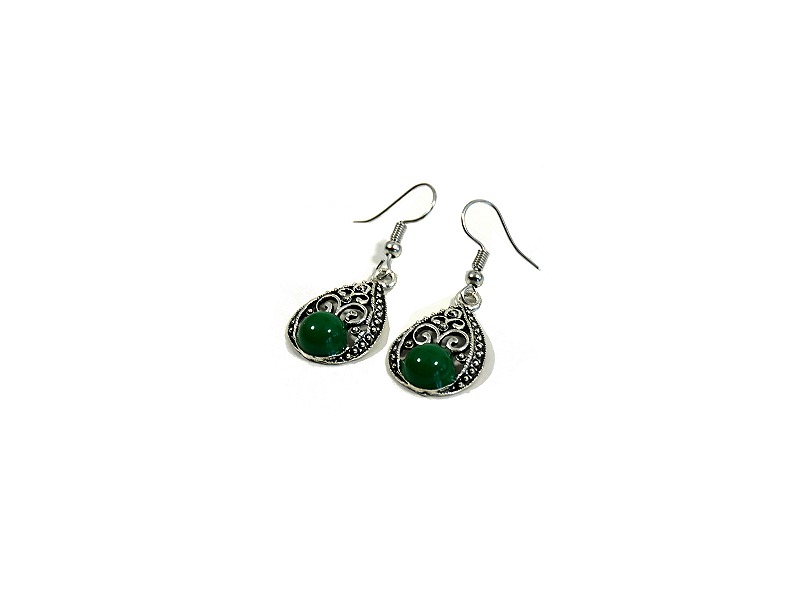 Boucles d'oreilles pendantes en métal argenté ciselé serties de pierres vert - REF. 29578 (5.90 €)