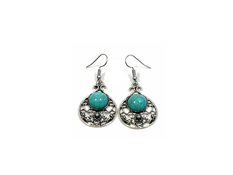 Boucles d'oreilles pendantes, style berbère, fabriquées en métal argenté - composition argent - délicatement ciselé, serties de pierres vert-bleu.