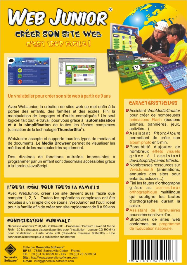 Avec WebJunior, créer son site devient aussi facile que compter 1, 2, 3... Toutes les opérations complexes ont été réduites à un simple clic de souris. WebJunior est l’outil idéal pour la famille afin de créer son site rapidement de 9 à 99 ans