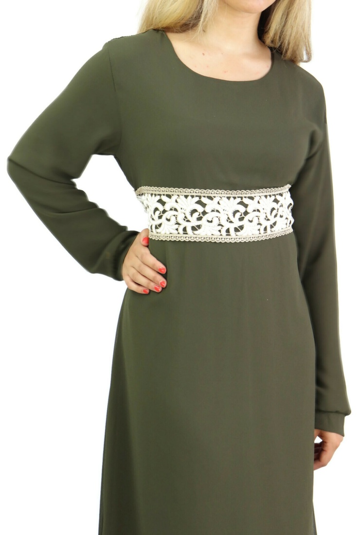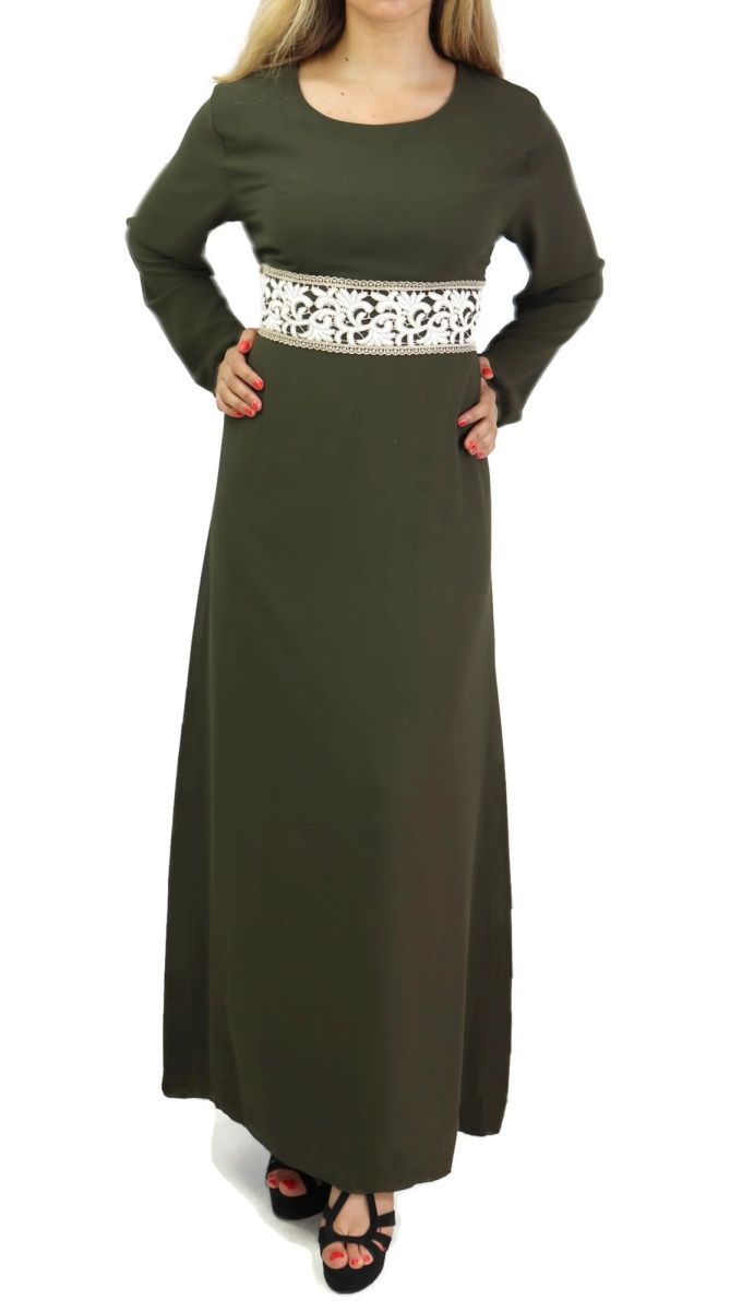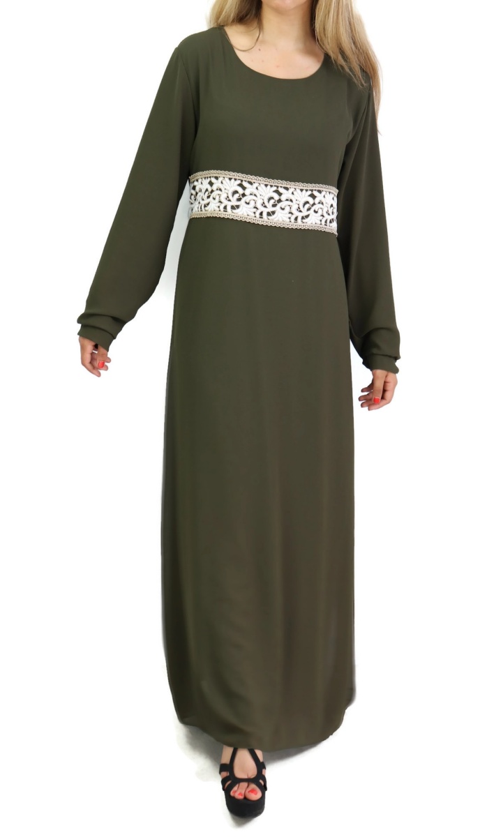 Robe longue avec broderies blanches et dorees - Couleur kaki