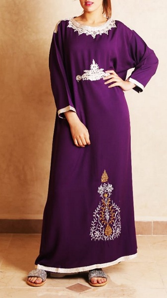 Gandoura/Robe marocaine chic avec strass et broderies manches trois quarts - Couleur Violet Vetement & Accessoire