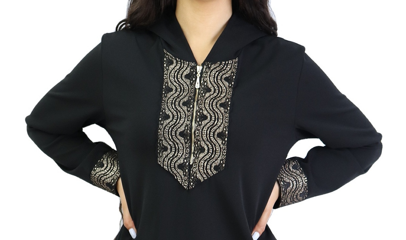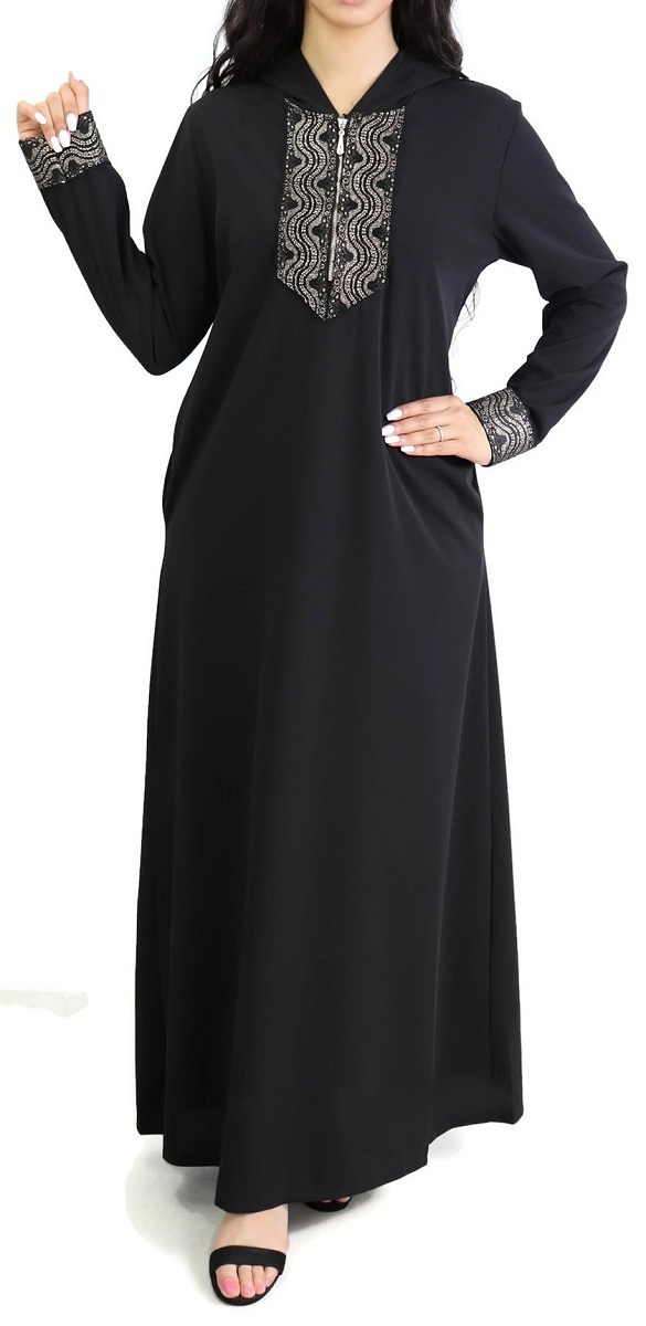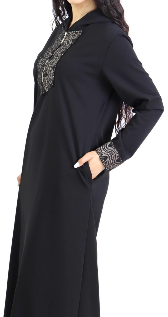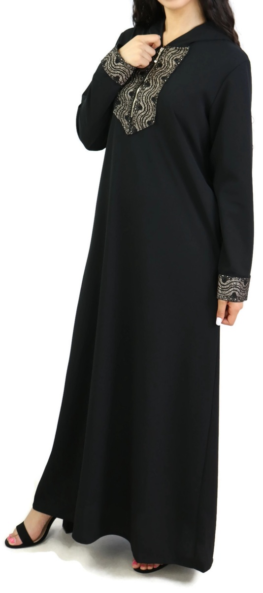 Robe longue type abaya marocaine moderne avec capuche et motifs dorés pour femme - Couleur noire Vetement & Accessoire