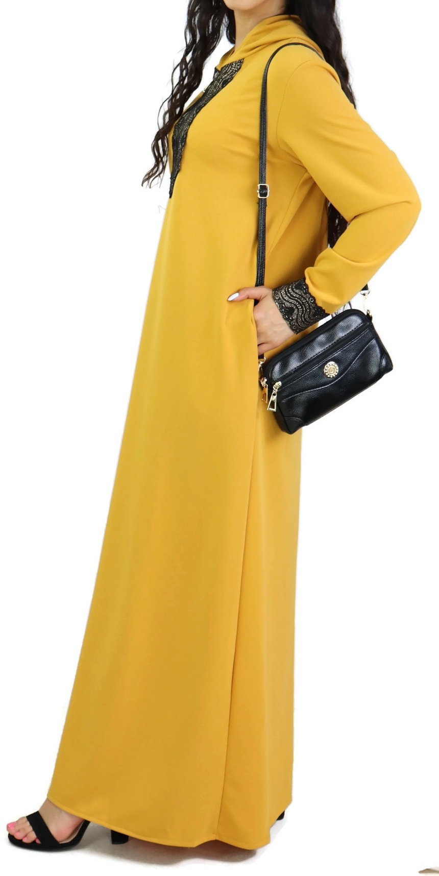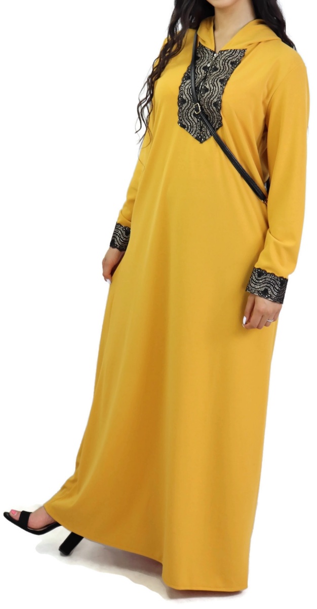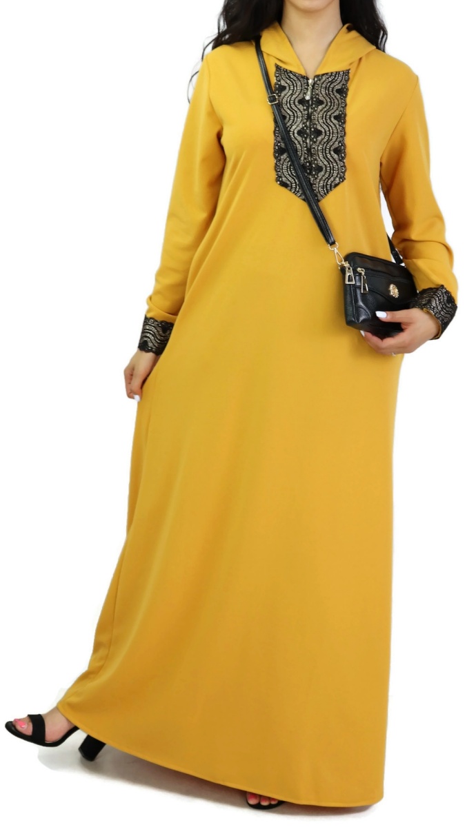 Robe longue moderne type abaya du Maroc avec capuche et motifs dorés pour femme - Couleur jaune moutarde Vetement & Accessoire