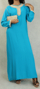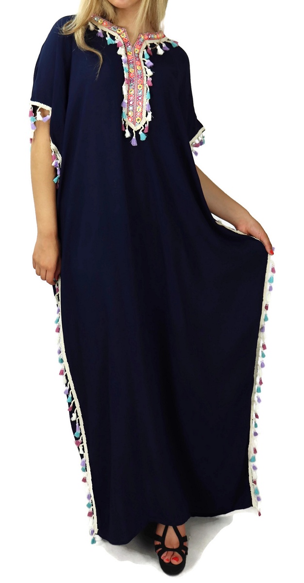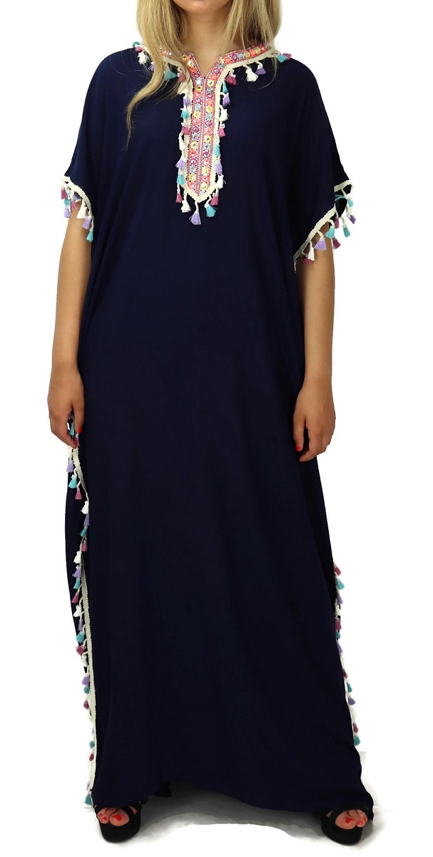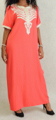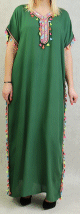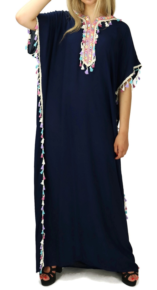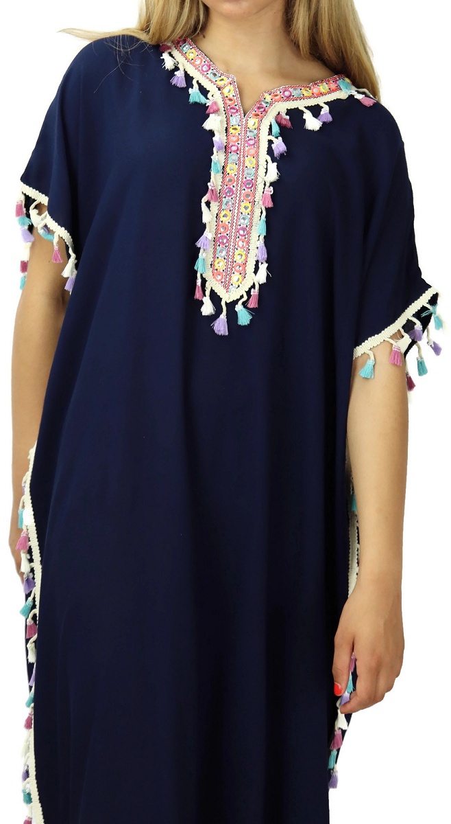 Robe orientale avec broderies et pompons, coupe droite, col tunisien ouvert, sans manches.La coupe de cette djelaba ainsi que sa matière faciliteront une décontraction évidente.