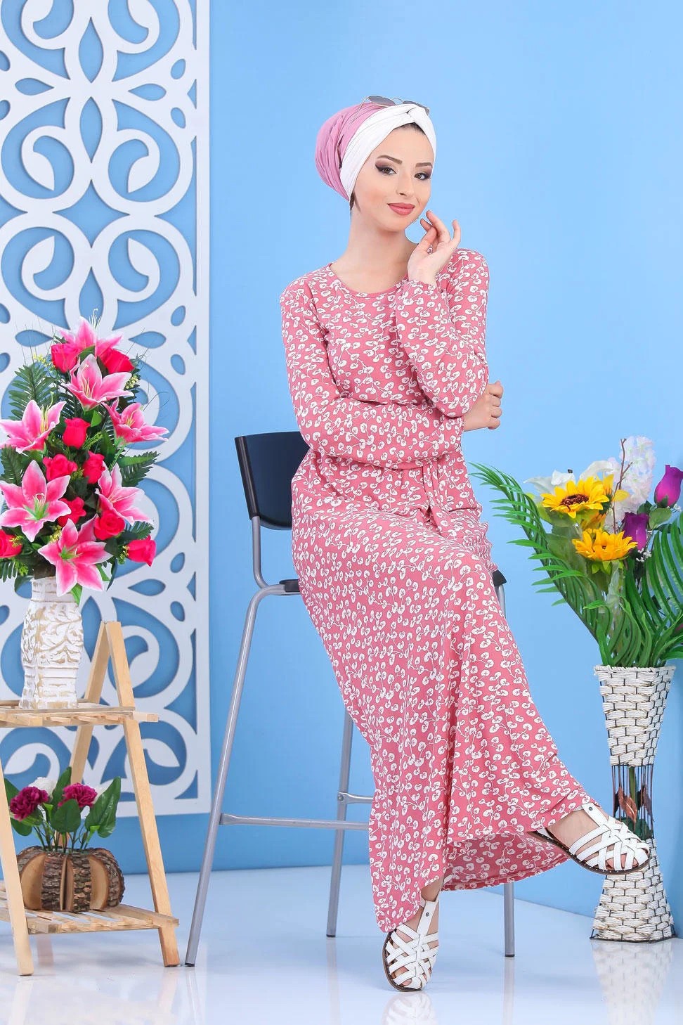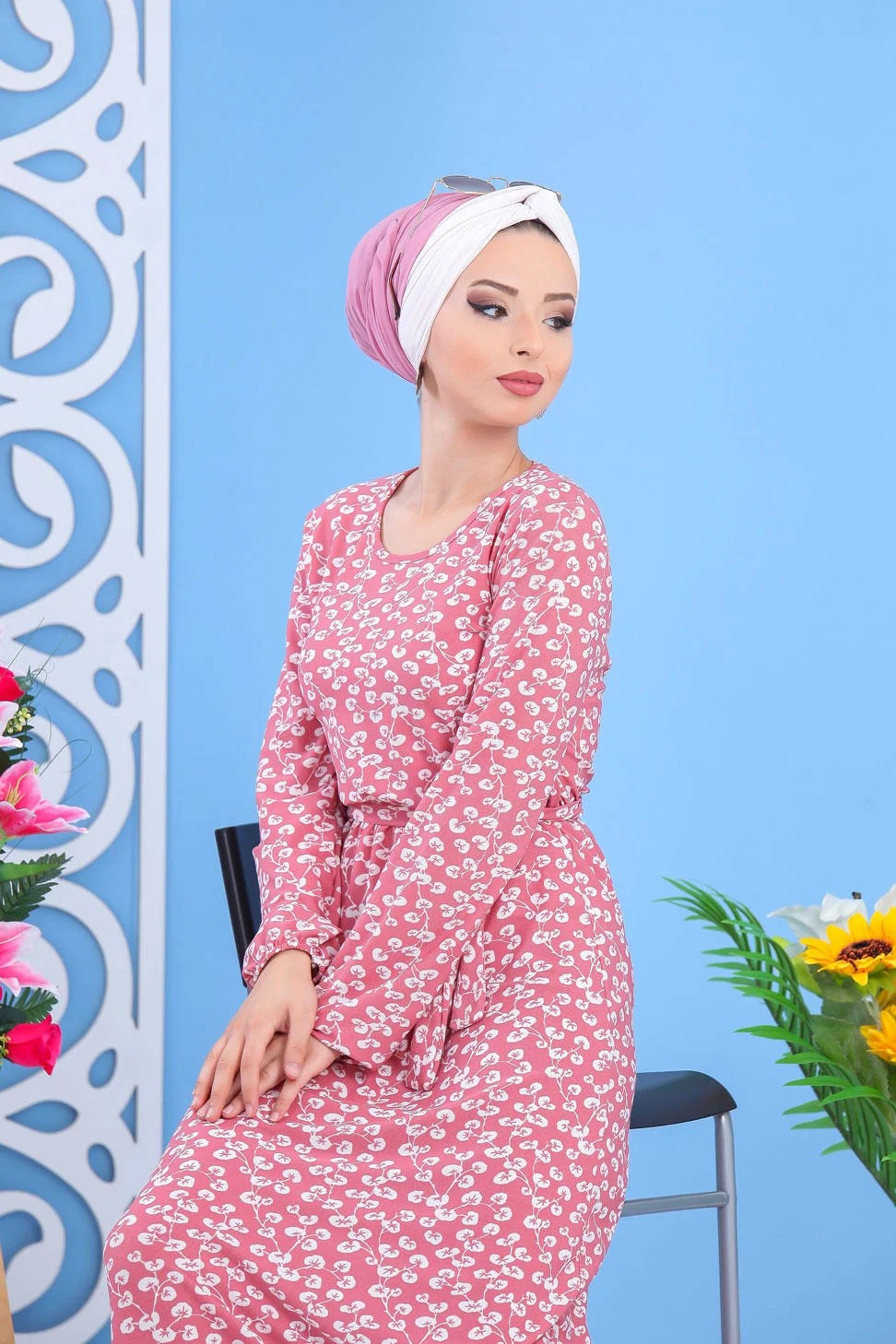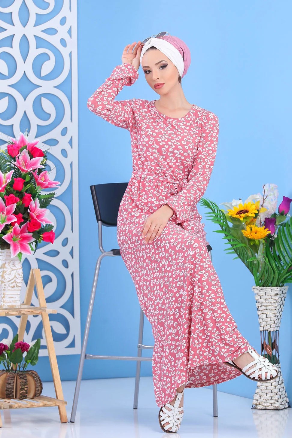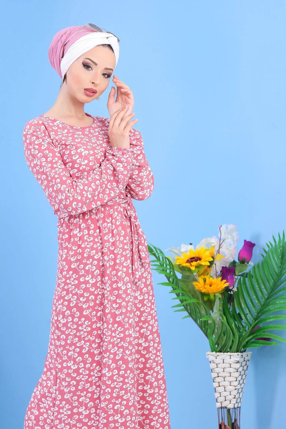 Robe longue (Maxi Dress), imprimés nénuphar de couleur blanc, col rond, élastiques a la taille et aux poignets, accommodée d'une ceinture, coupe évasée.