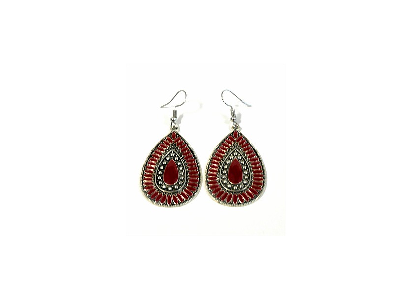 Boucles d'oreilles pendantes en métal argenté ciselé serties de pierres bordeaux - REF. 29553 (5.90 €)