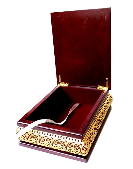 Vous aimez voir votre maison bien organisée ? Nous vous proposons une solution pour la garder ordonnée. Grâce à ce grand coffret en bois avec décorations métalliques dorées sur le haut et tout autour, intérieur en velours rouge, vous pouvez ranger un Coran de taille 27 x 20 cm (non fourni).