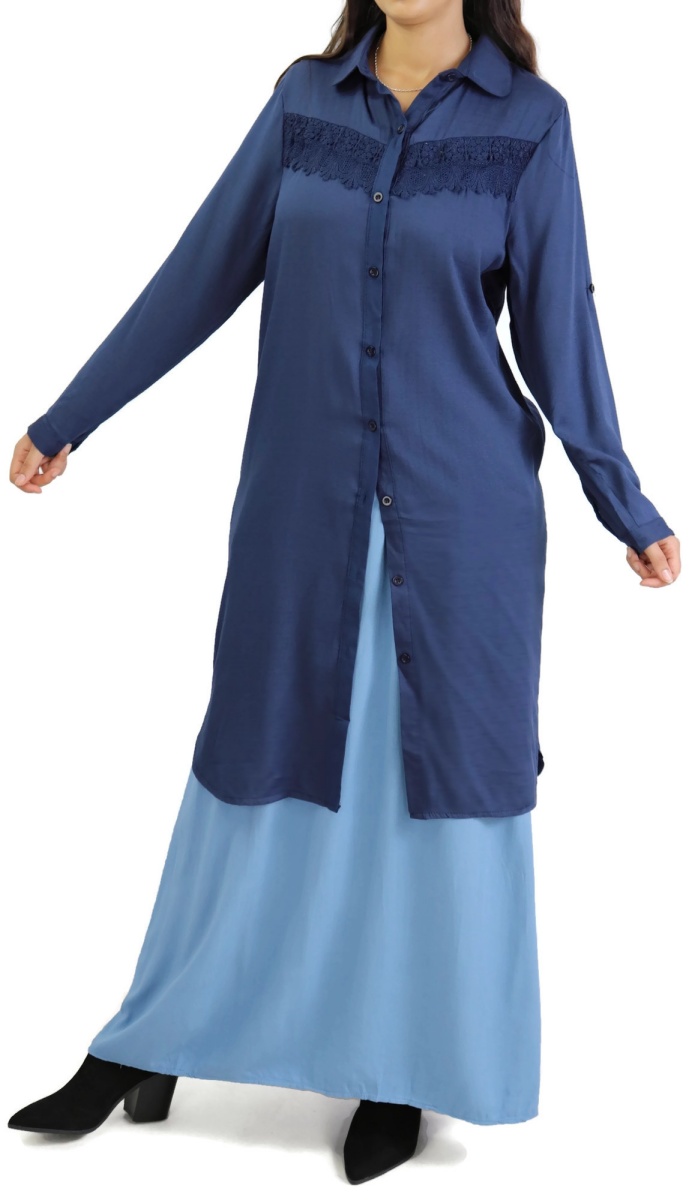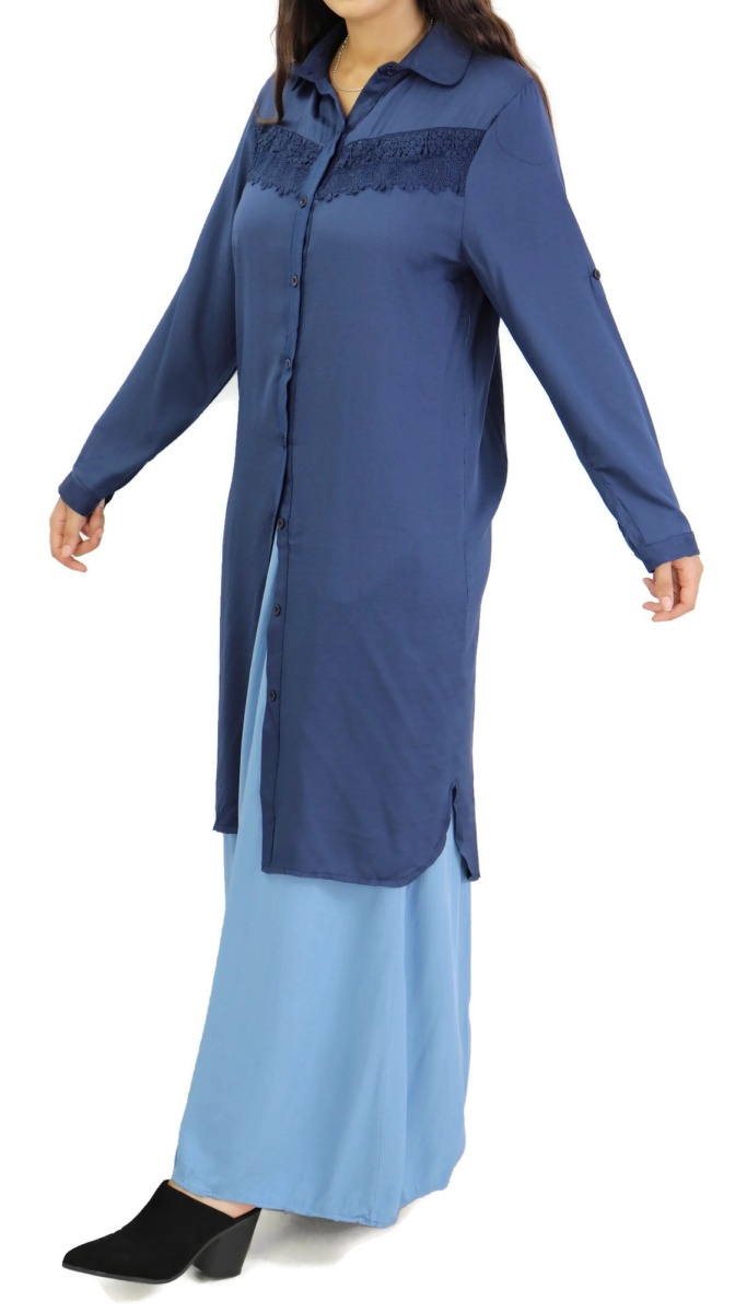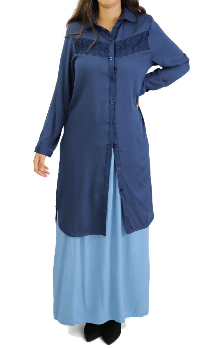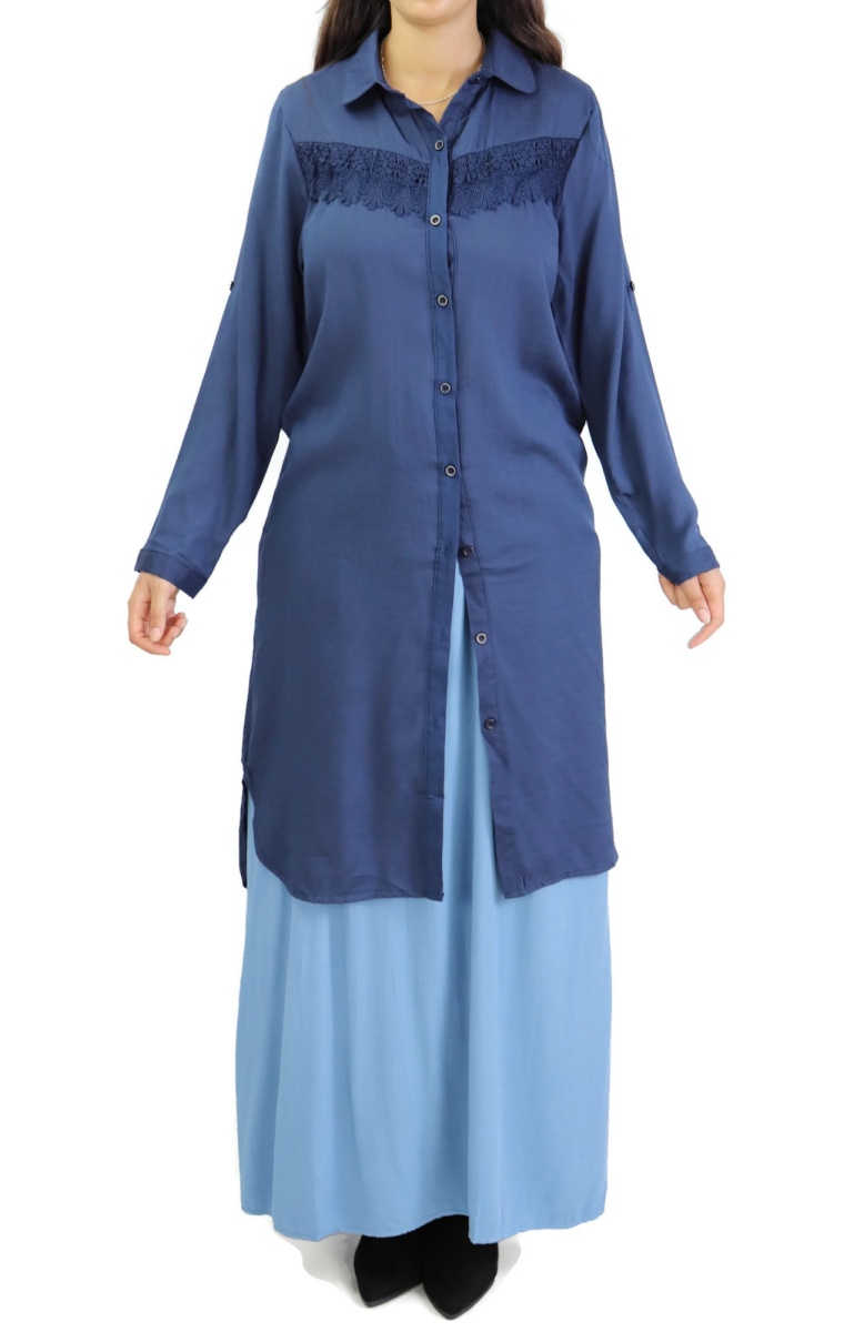 Chemise longue avec petites dentelles sur le devant. Les manches sont retroussables se replient grâce à une patte de boutonnage cousue à l’intérieur des manches, vous pouvez les retrousser en un clin d’œil et transformer ainsi votre chemise à manches longues en chemise à manches courtes.