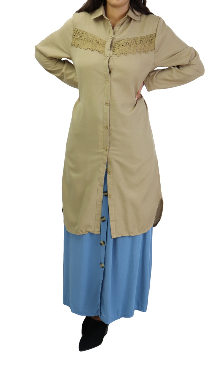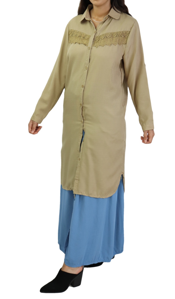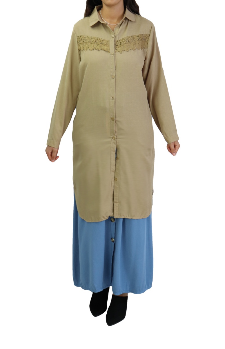 Chemise longue avec petites dentelles sur le devant. Les manches sont retroussables se replie grâce à une patte de boutonnage cousue à l’intérieur des manches, vous pouvez les retrousser en un clin d’œil et transformer ainsi votre chemise à manches longues en chemise à manches courtes.