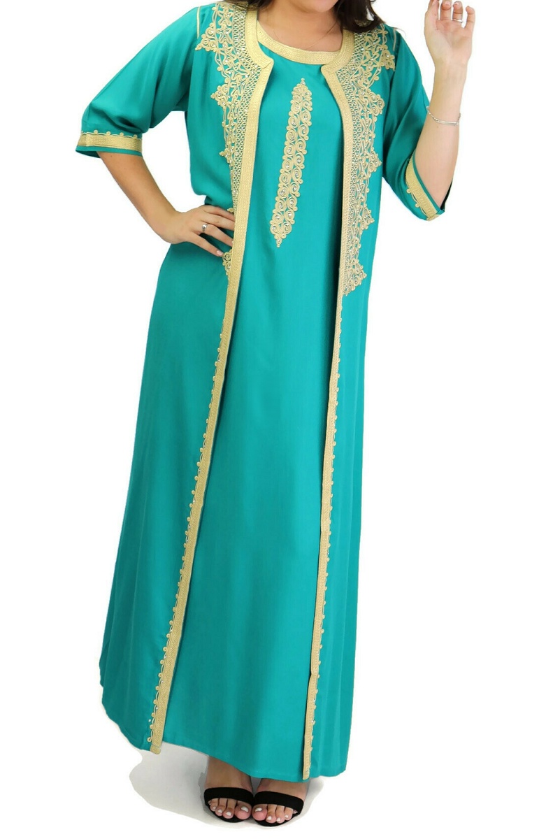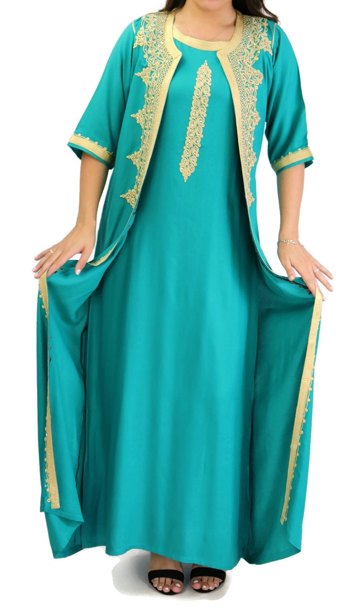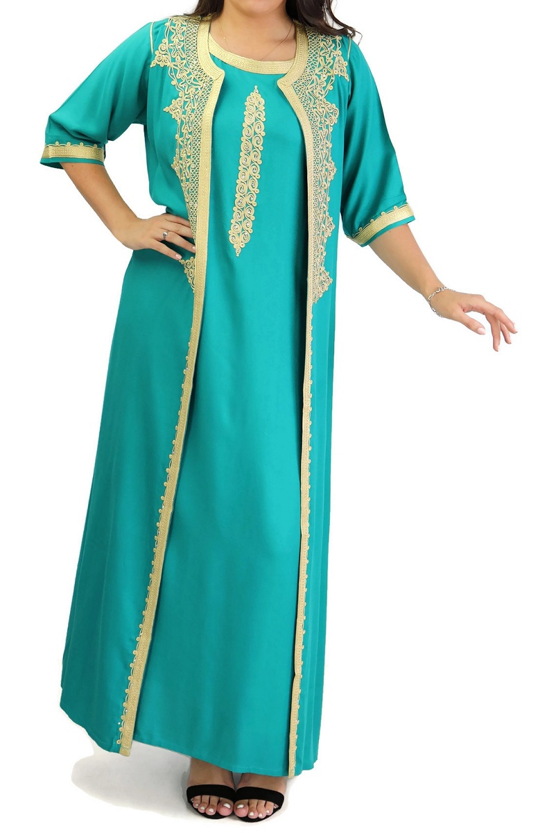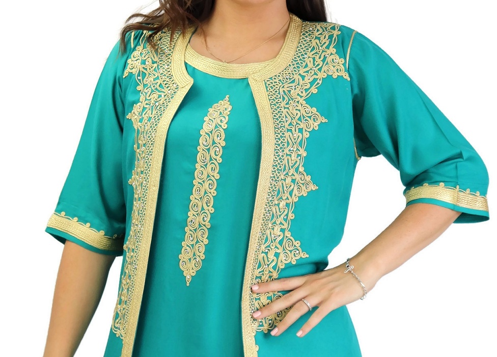 Belle gandoura traditionnelle marocaine, entièrement brodée à la main par des artisans marocains qualifiés. Constituée de deux pièces la robe et son gilet.