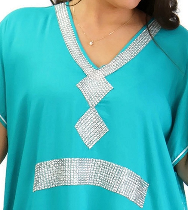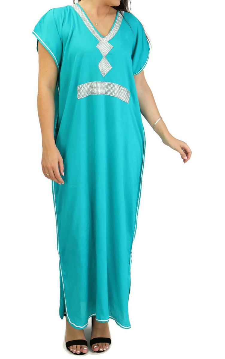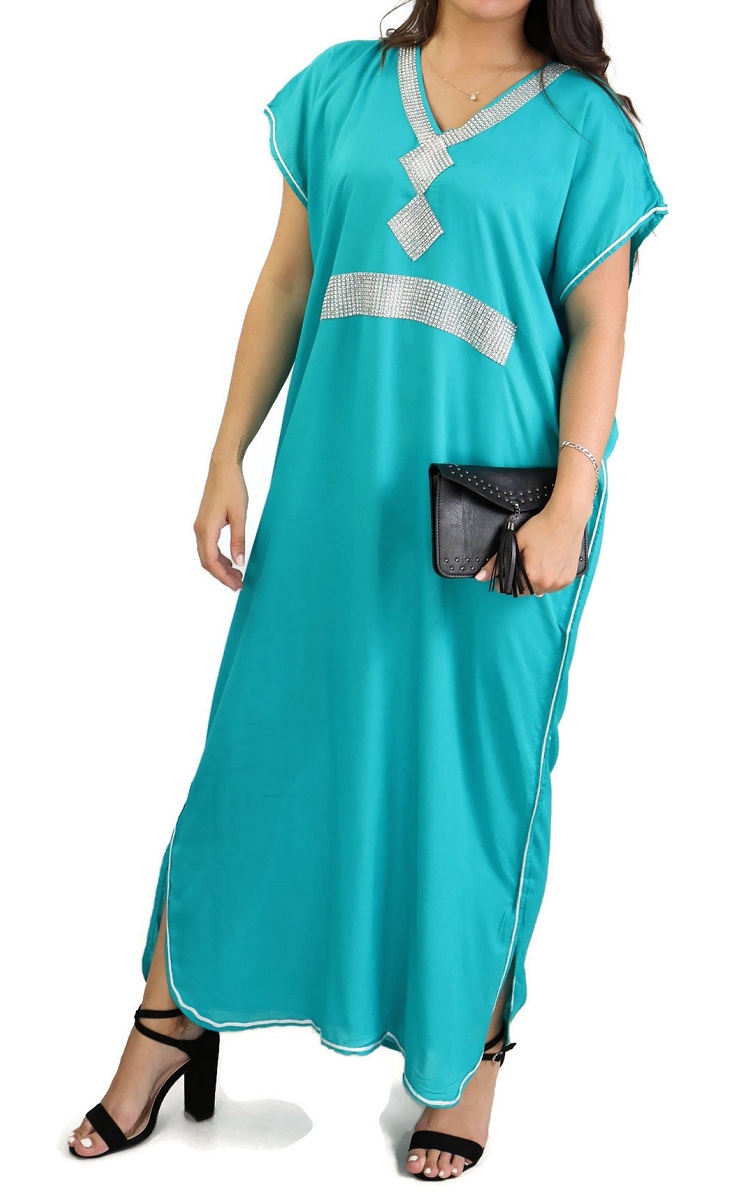 Robe gandoura marocaine avec strass argenté pour la maison - Couleur Vert émeraude Vetement & Accessoire