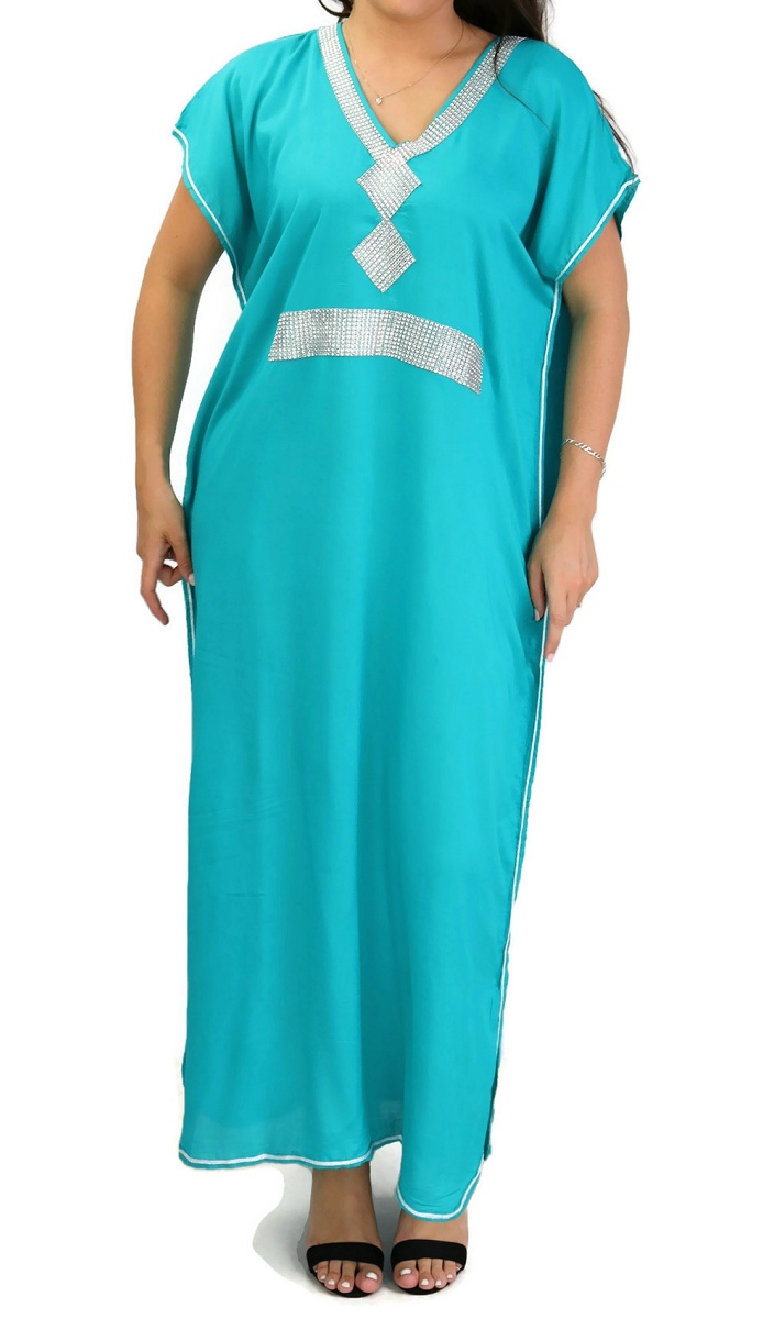Robe gandoura marocaine avec strass argente pour la maison - Couleur Vert emeraude