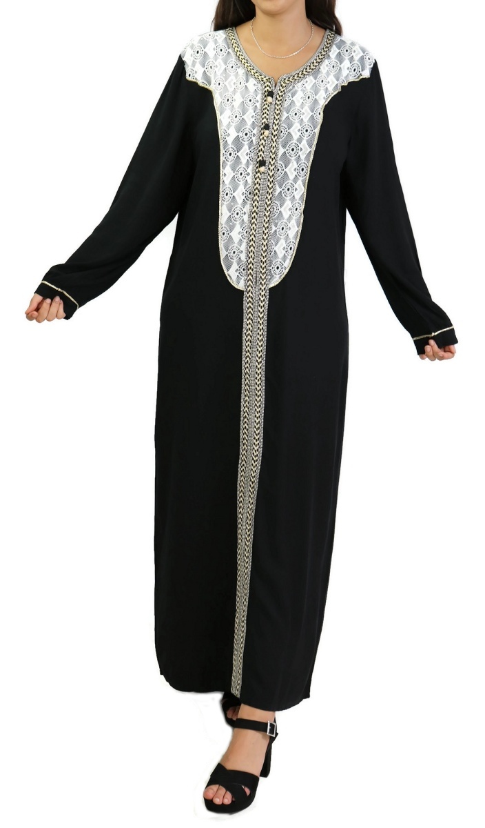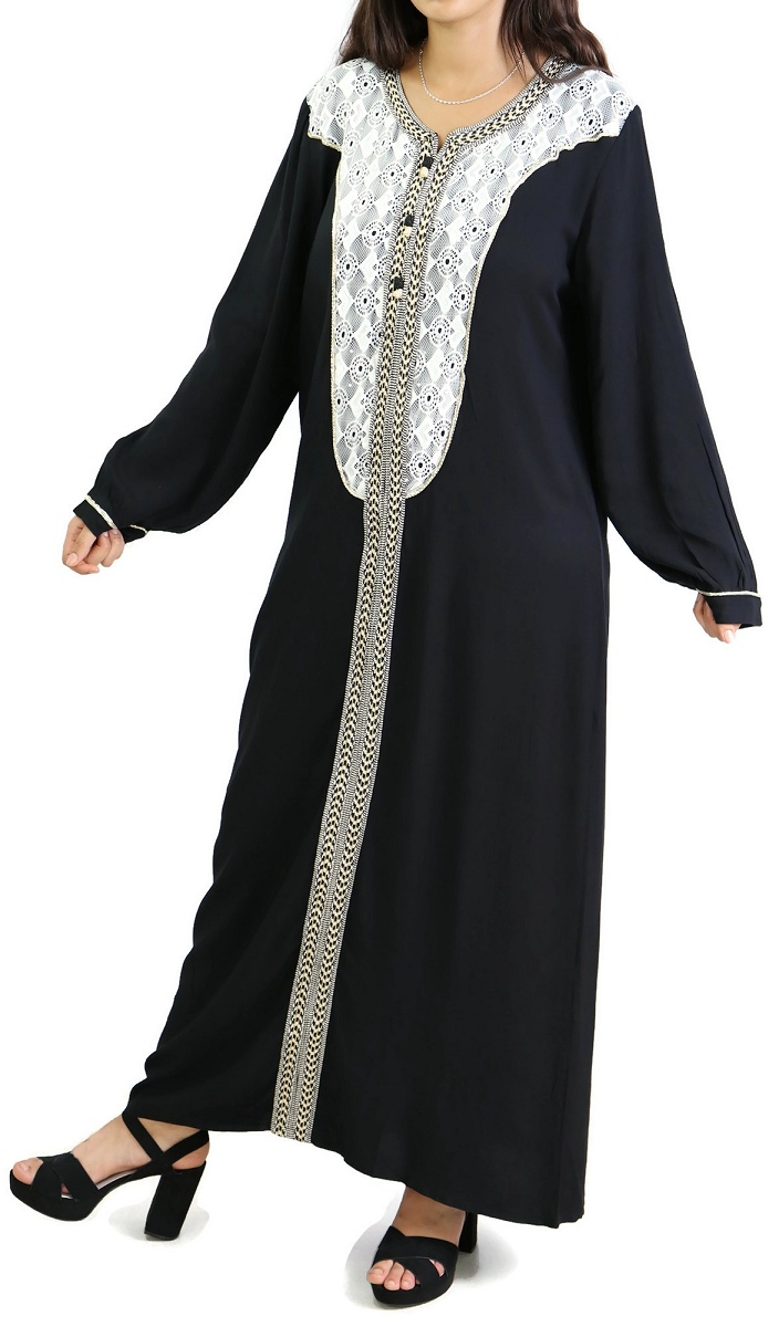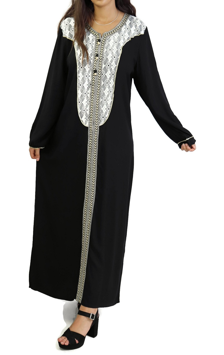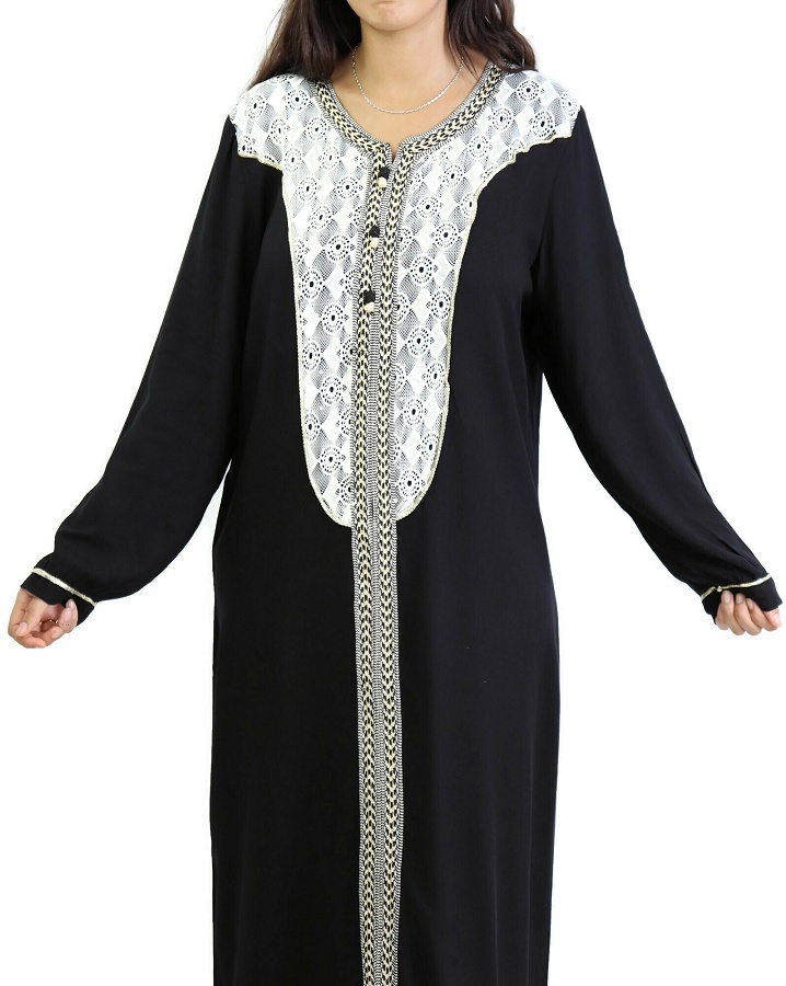 A dentelles sur la partie du haut, elle se finit par une belle broderie artisanale et un fil doré sur les poignets.