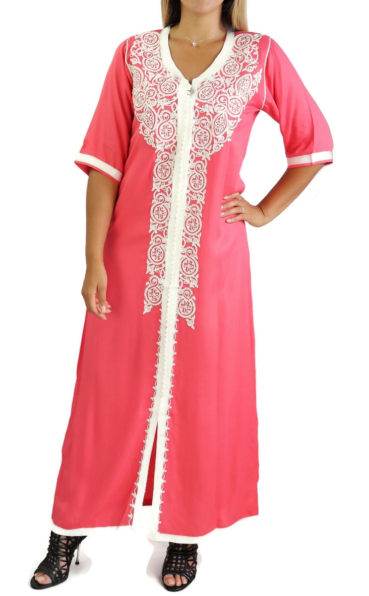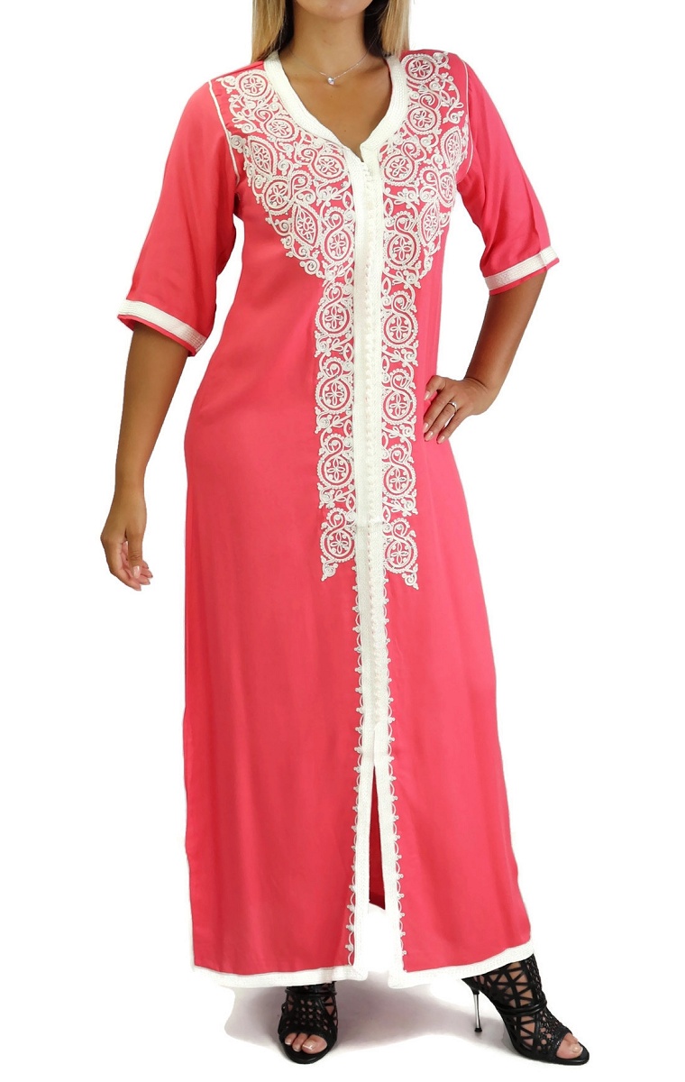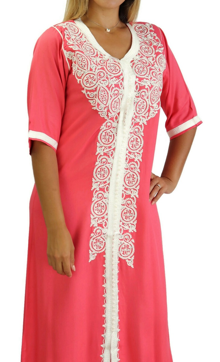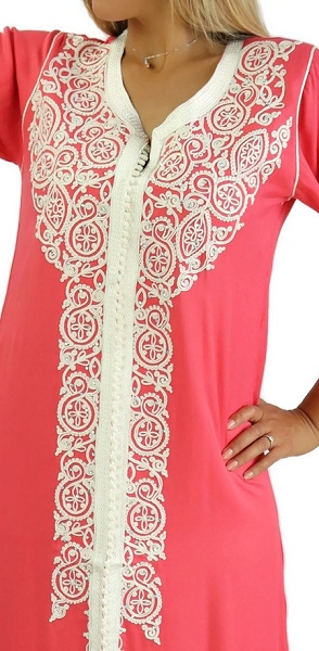 Robe marocaine traditionnelle brodée pour femme - Manches courtes - Couleur Corail Vetement & Accessoire