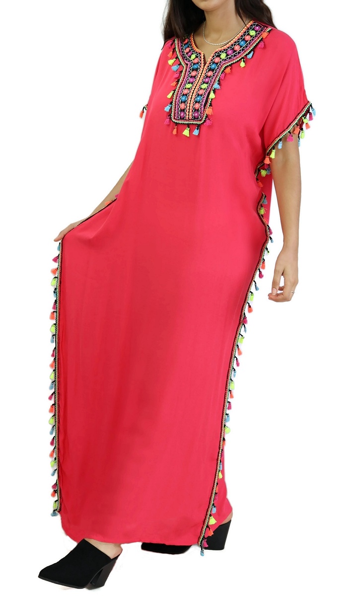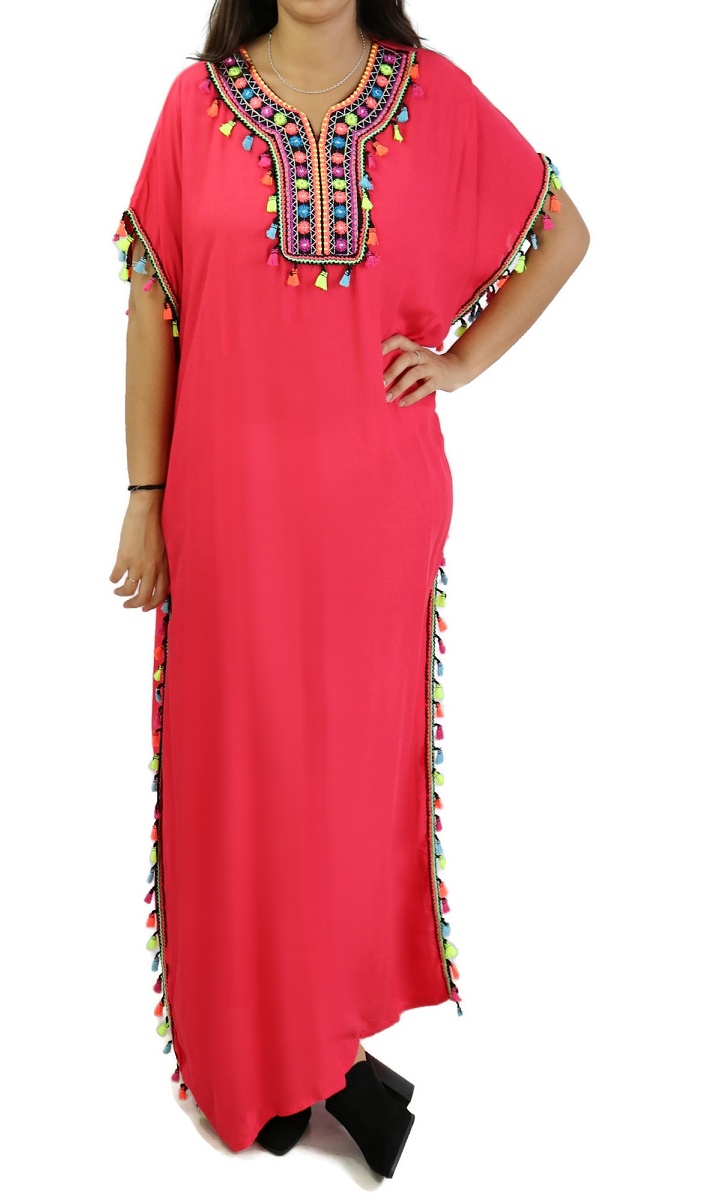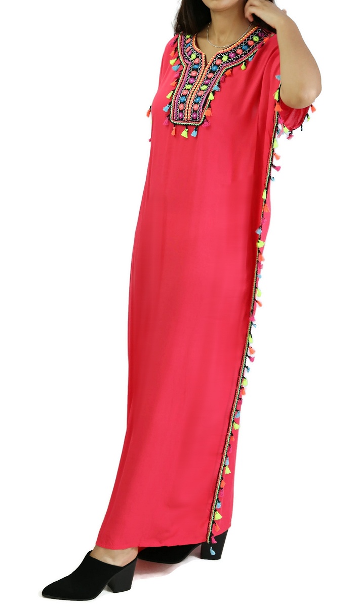 Robe orientale avec broderies et pompons, coupe droite, col rond semi ouvert, sans manches.La coupe de cette djelaba ainsi que sa matière faciliteront une décontraction évidente.