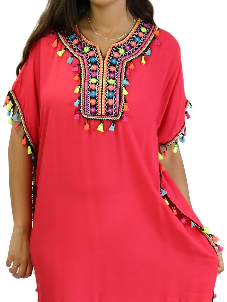 Robe orientale d'été avec pompons multicolores - Couleur rouge capucine Vetement & Accessoire