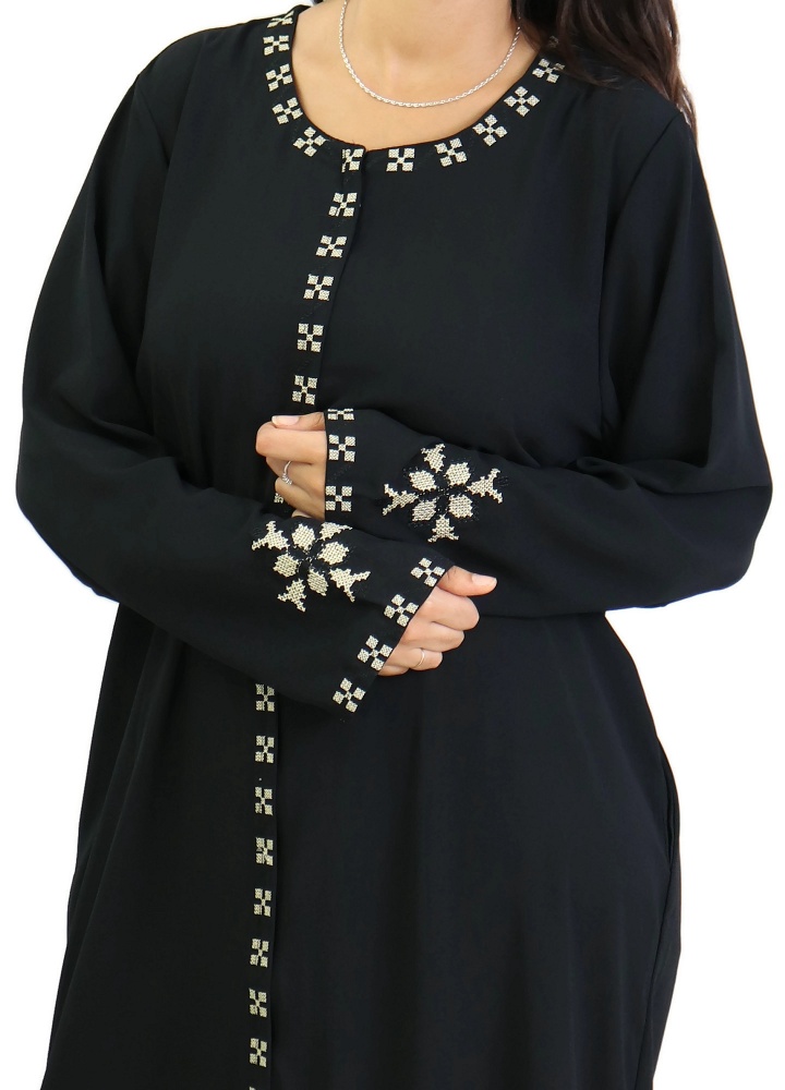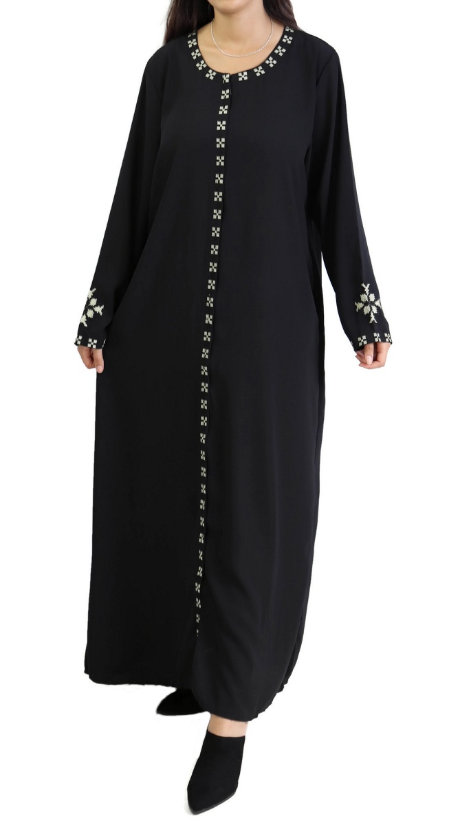 Robe longue col rond brodé, s'ouvre entièrement avec fermeture éclair décorée de broderies ainsi sur les poignets, poches latérales. Disponible dans différentes couleurs.