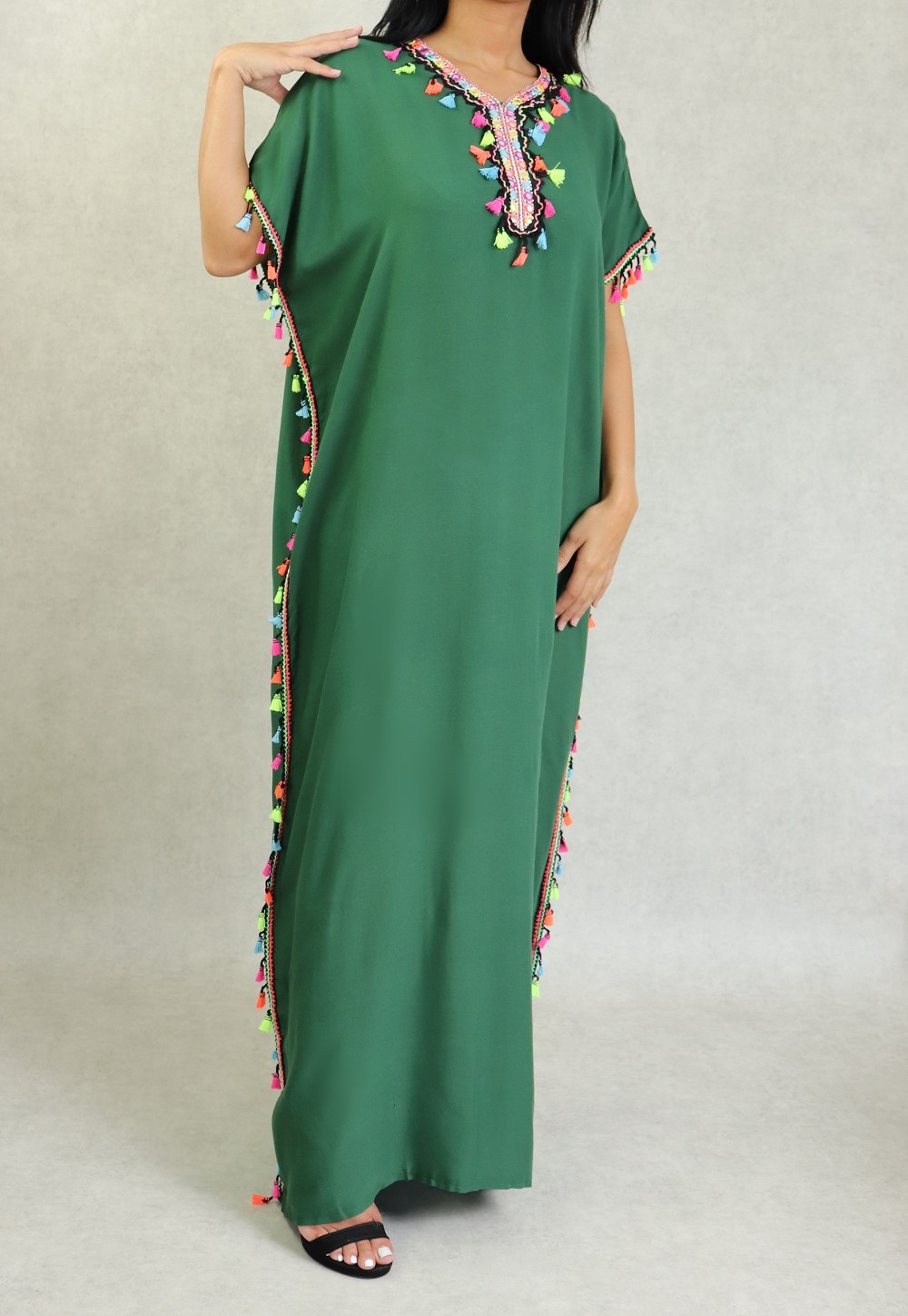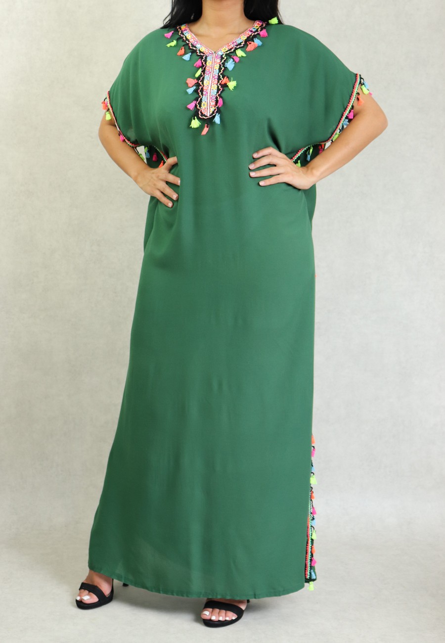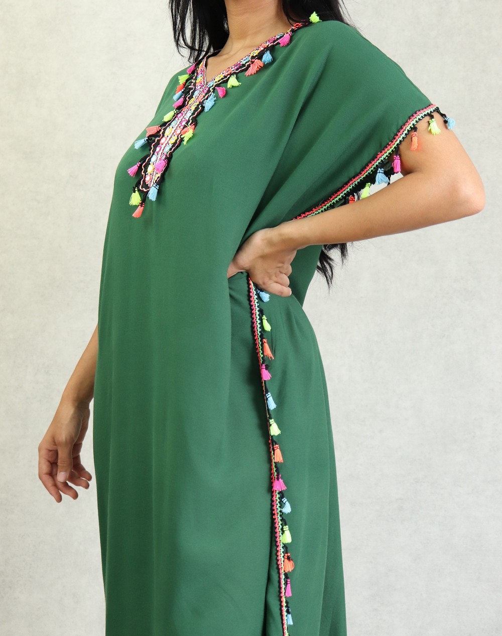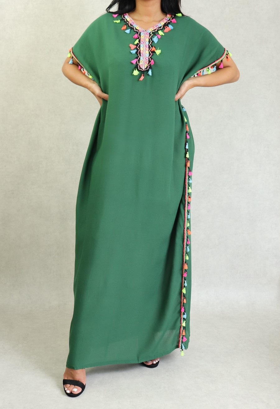 Robe orientale avec broderies et pompons, coupe droite, col rond semi ouvert, sans manches. La coupe ainsi que sa matière faciliteront une décontraction évidente.