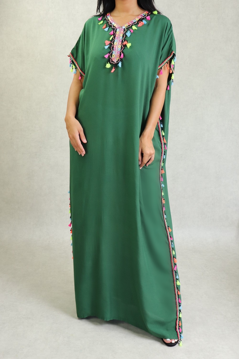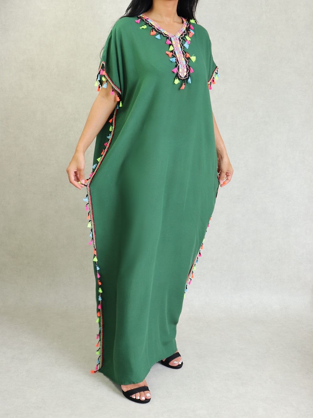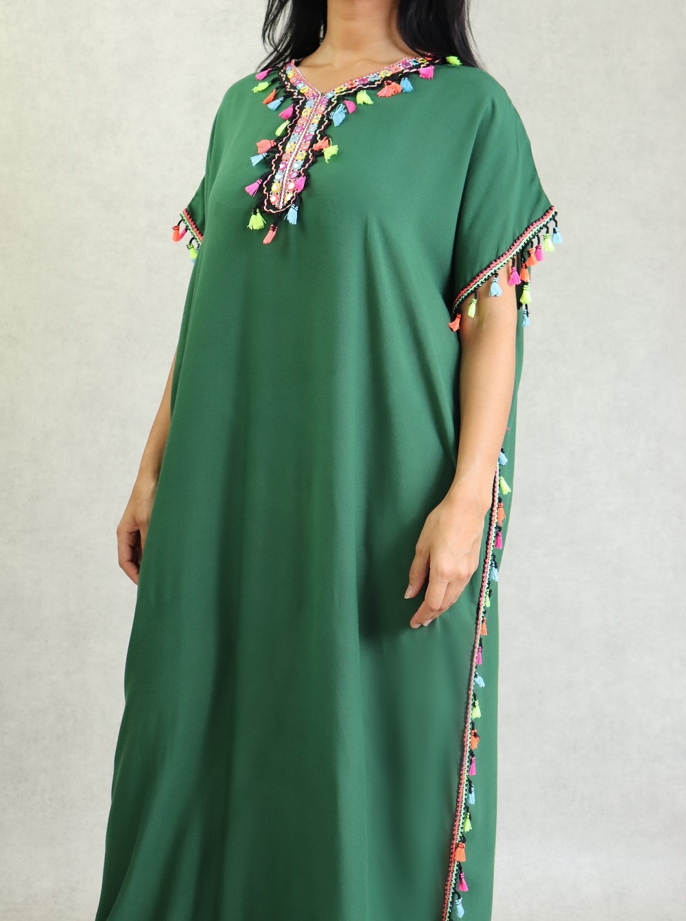 Robe orientale avec broderies et pompons, coupe droite, col rond semi ouvert, sans manches. La coupe ainsi que sa matière faciliteront une décontraction évidente.