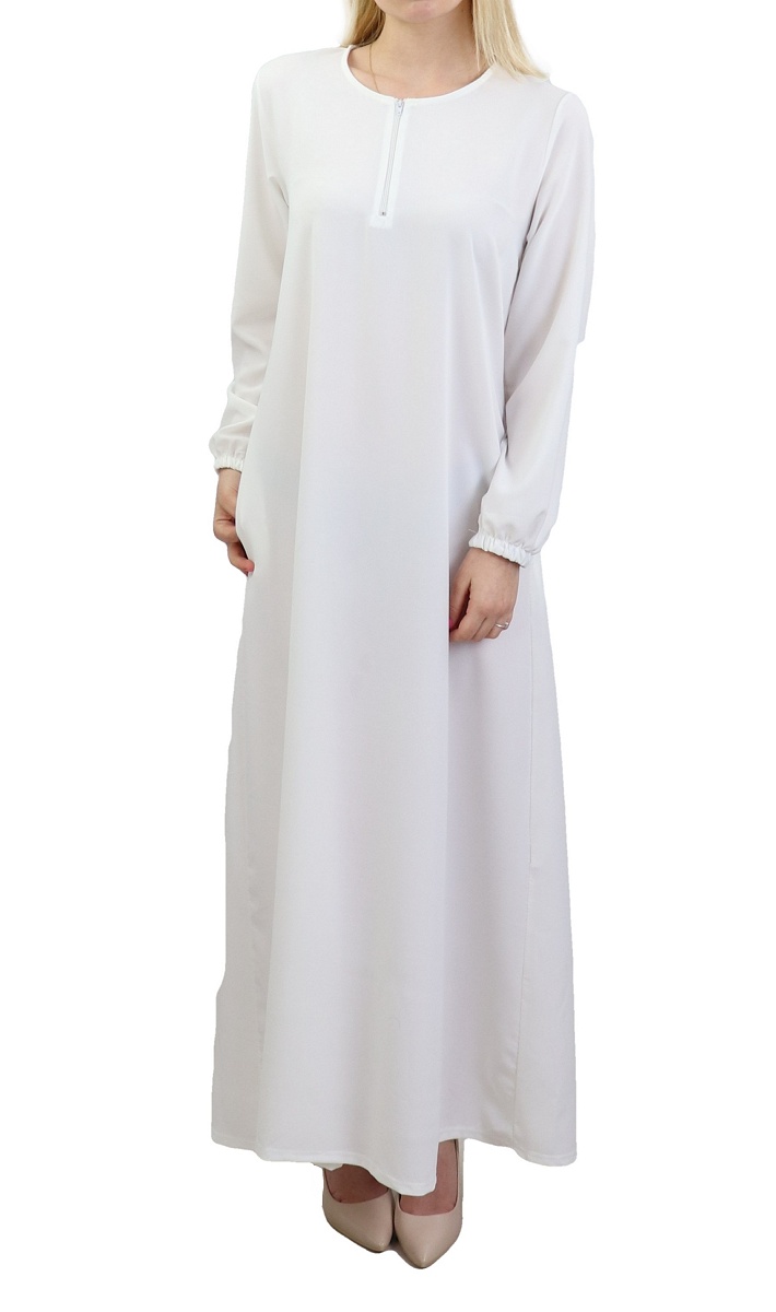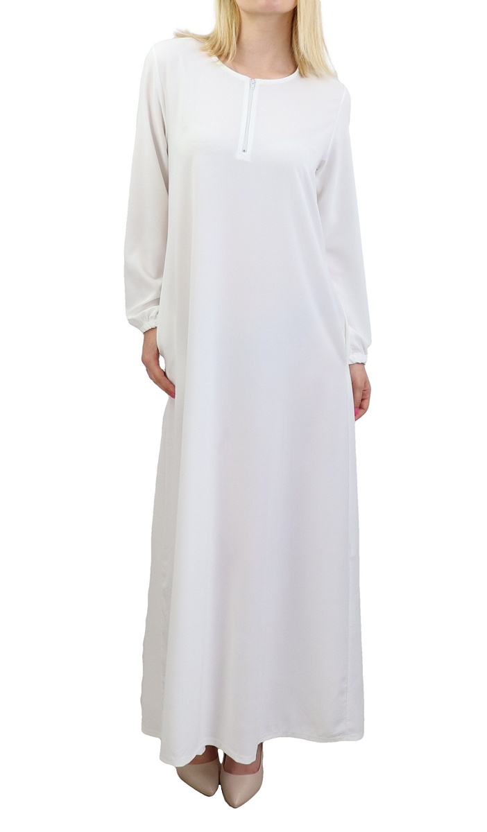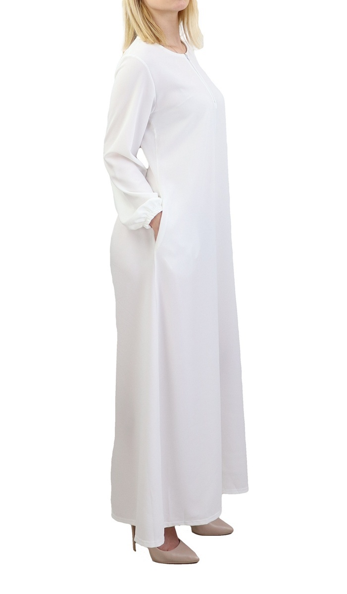 Robe longue, col rond, manches finition élastiques, fermeture zippée devant, 2 poches latérales.