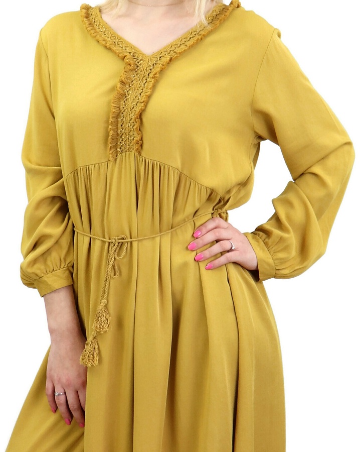 Tunique longue, col brodé ceinture assortie avec passants, tissu doux et agréable, coupe évasée. Ce modèle est parfait pour la mi-saison, il fera son effet avec son style bohème. La ceinture peut s'attacher par devant ou derrière...