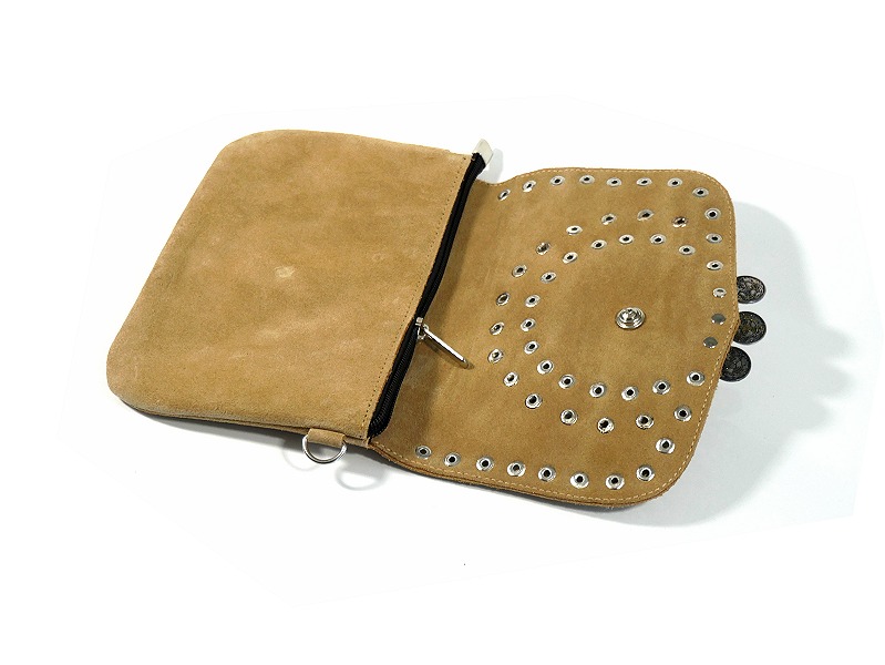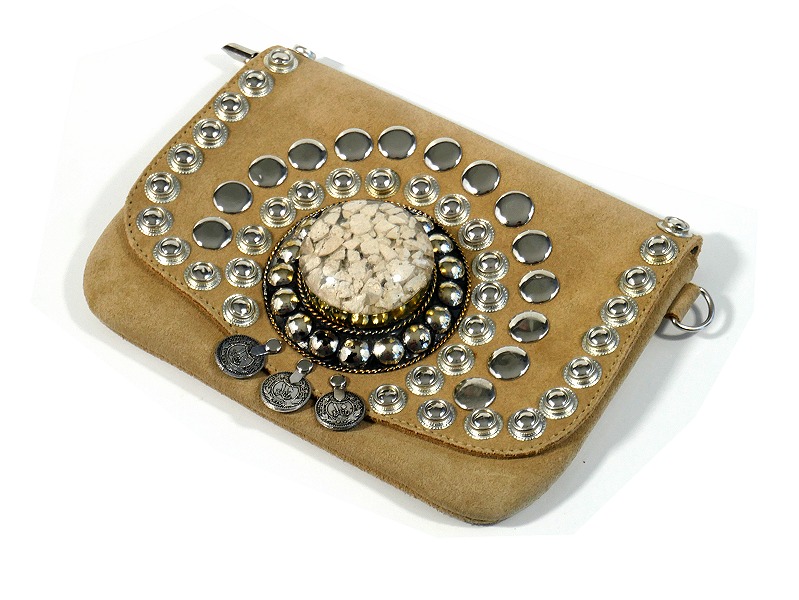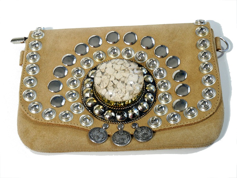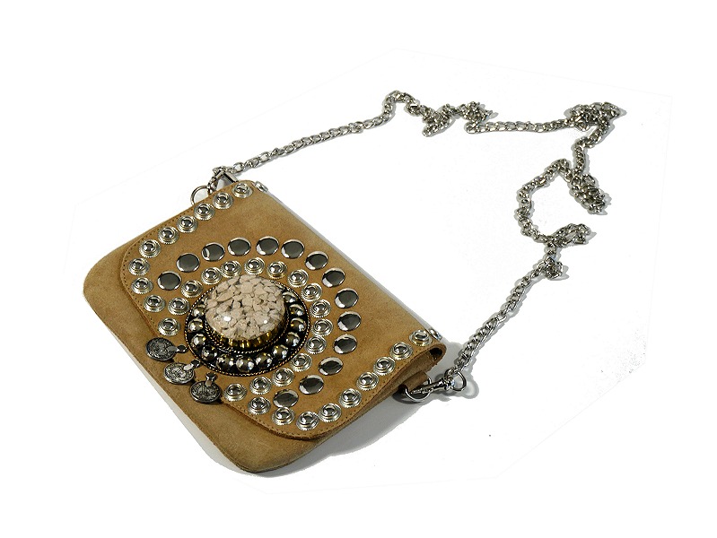 Sac à main cuir daim beige Ornement de pierres coulées dans un bloc de résine Vetement & Accessoire