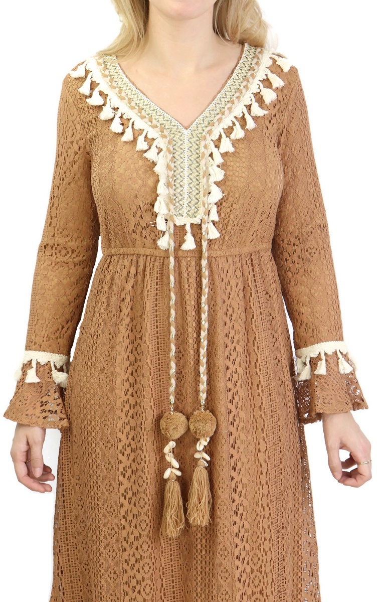 Robe de soiree en dentelles avec pompons - Couleur caramel