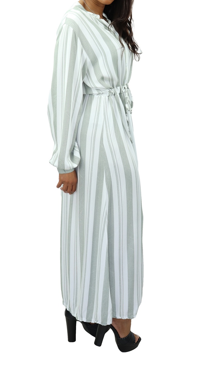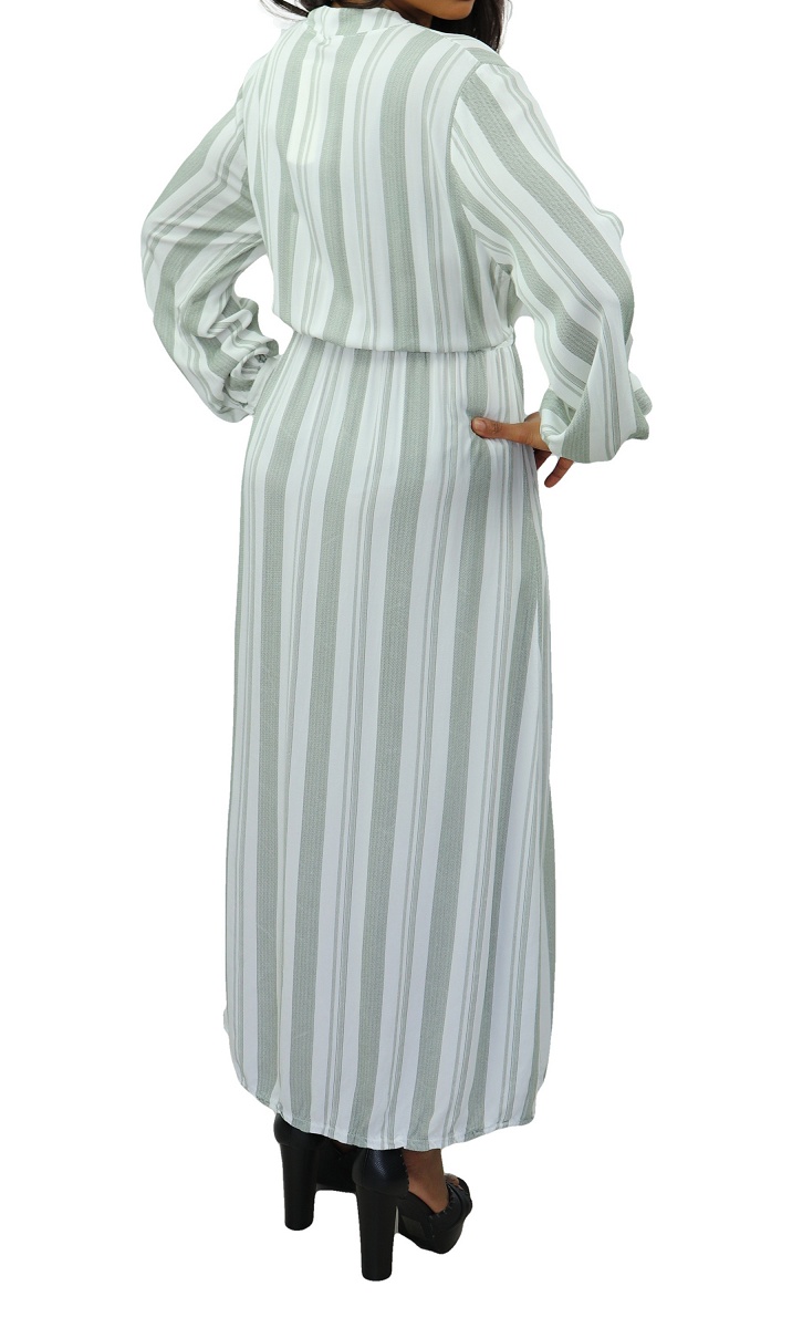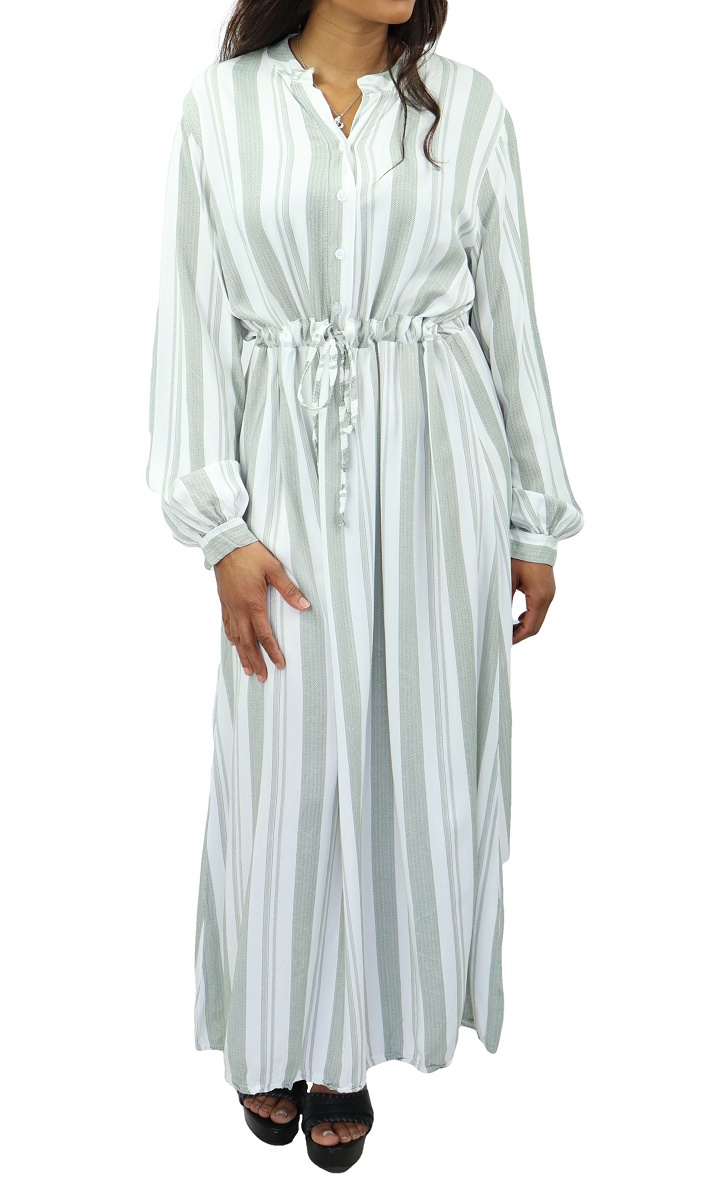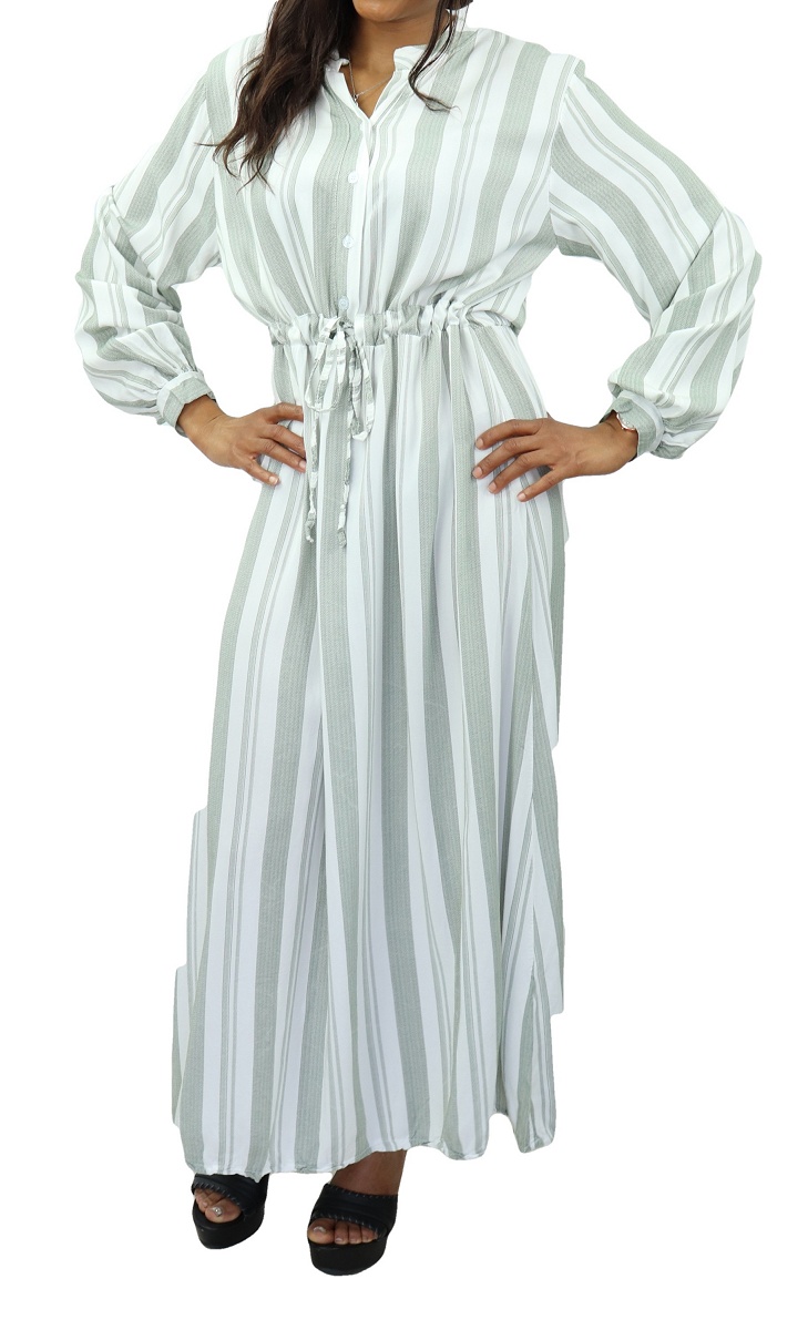 Robe à rayures boutonnée (ouverte) avec ceinture assortie (Vetement hijab été femme musulmane) - Couleur crème et kaki - REF. 33009 (25.00 €)