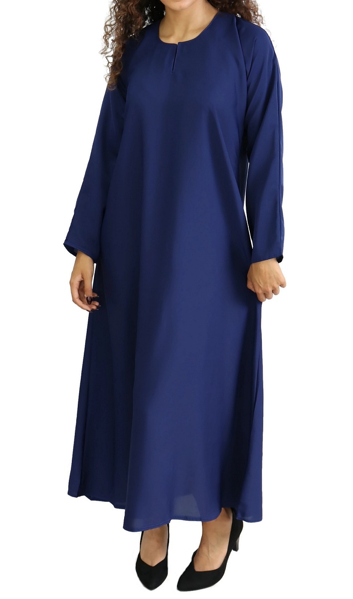 Nous apprécions la simplicité et la sobriété de cette robe évasée qui est livrée avec un châle léger qui peut servir de voile ou d'écharpe pour accessoiriser la robe. C'est un standard porté quotidiennement par les femmes au moyen orient...