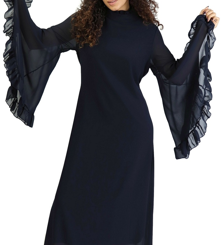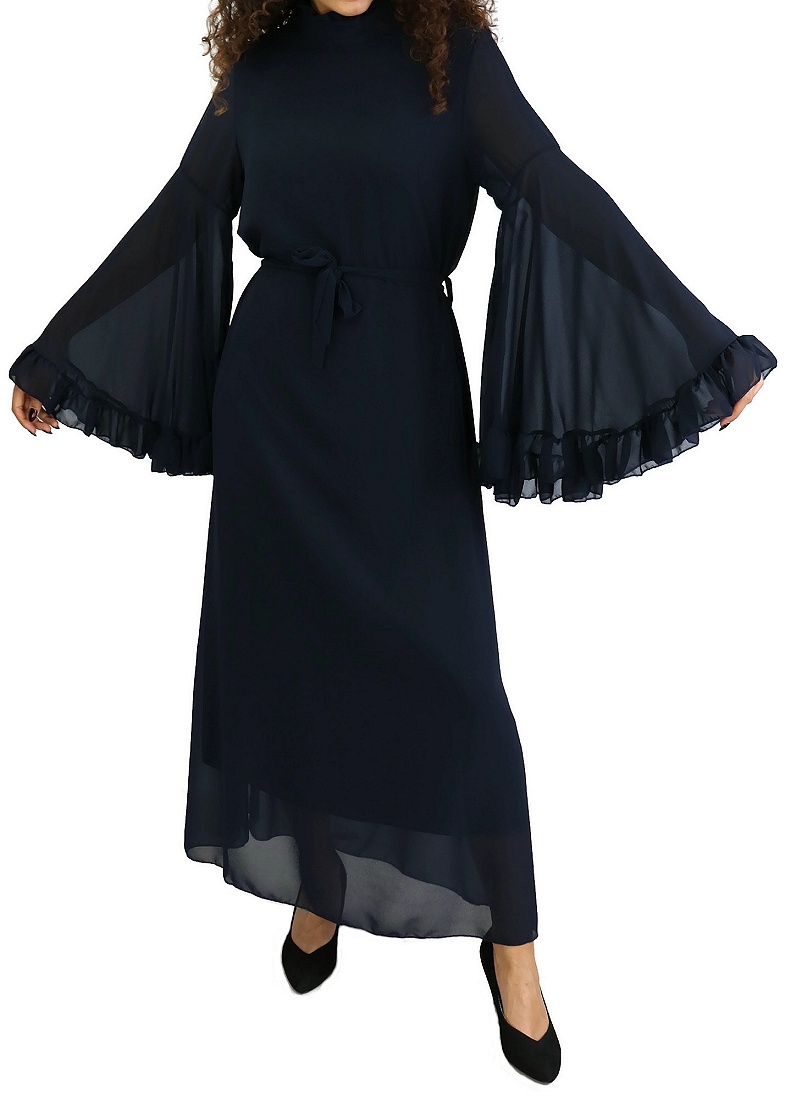 Robe col officier avec manches évasées et ceinture en ruban assortie - Couleur Bleu Nuit Vetement & Accessoire