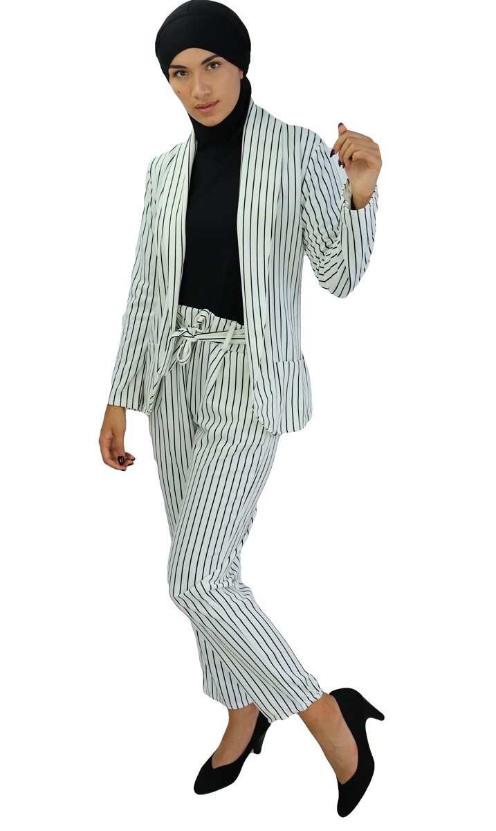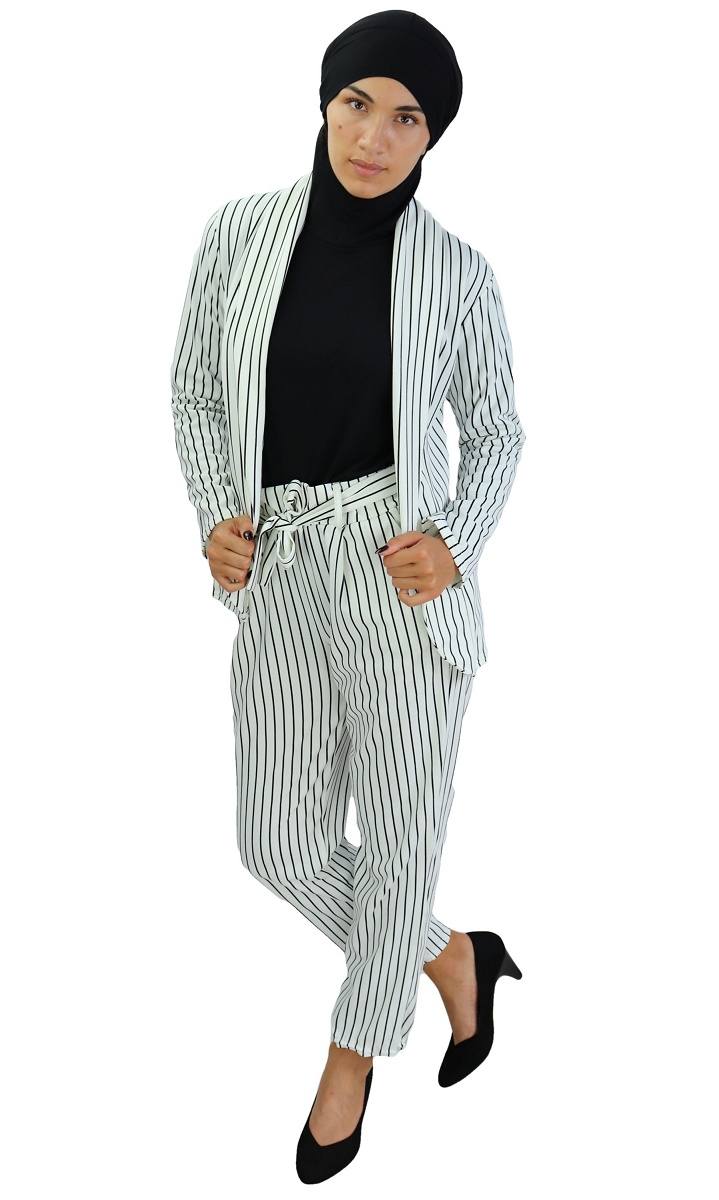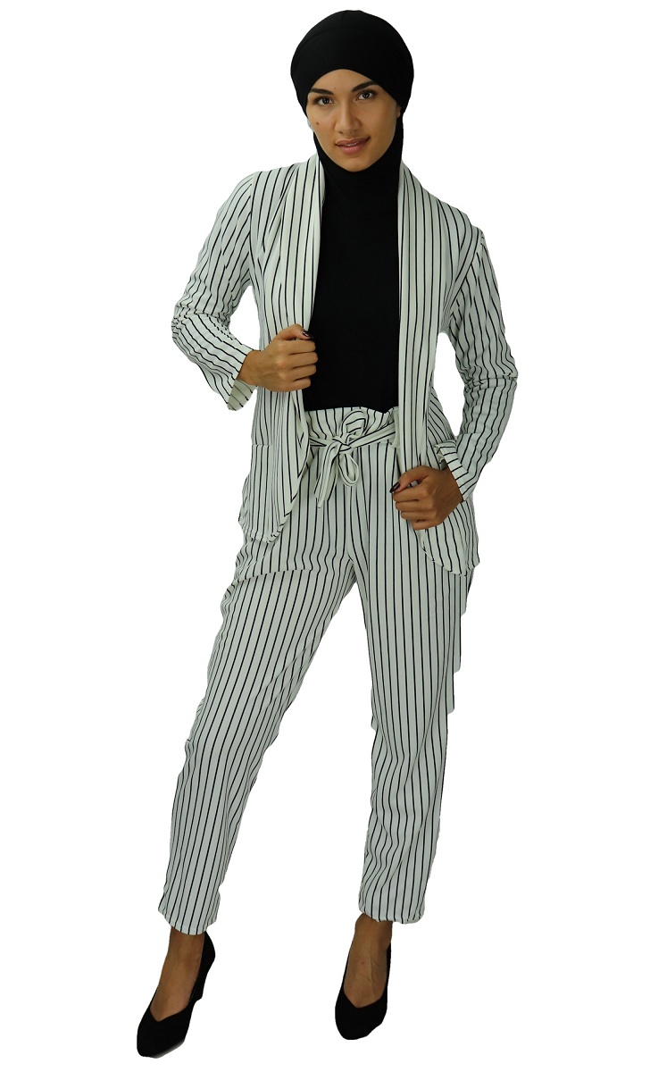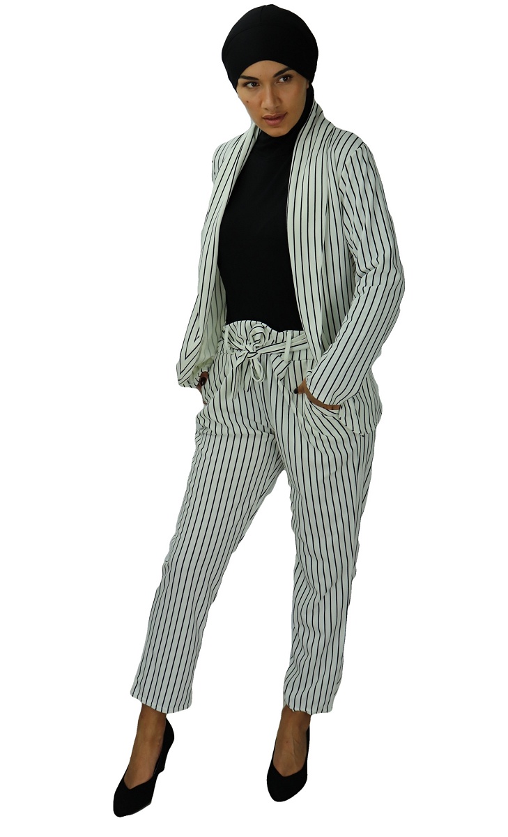 Veste tailleur souple et légère à rayures estivales très agréable à porter, col tailleur, deux poches plaquées, pantalon droit élastiqué à la taille avec ceinture à nouer et poches italiennes devant.