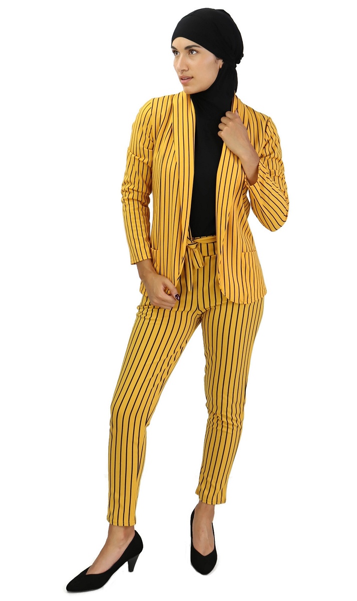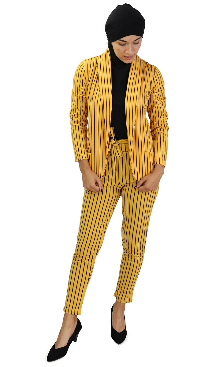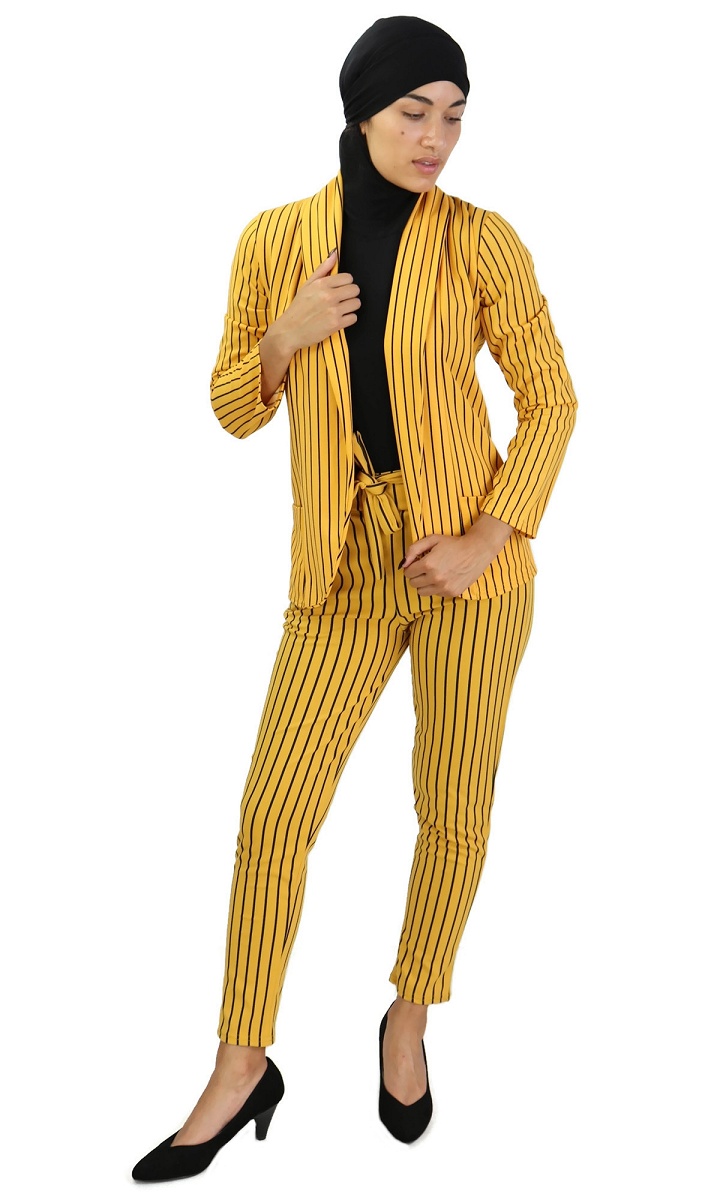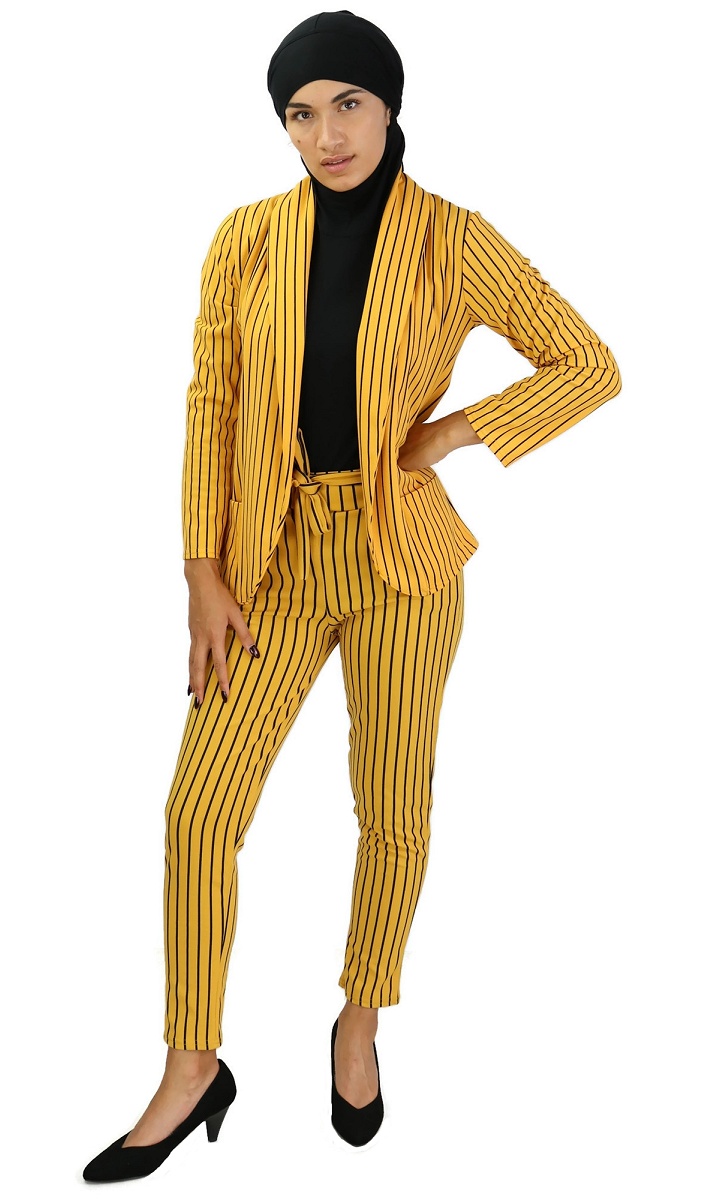 La Veste tailleur souple et légère à rayures estivales très agréable à porter, col tailleur, deux poches plaquée, pantalon droit élastiquée à la taille avec ceinture à nouer, poches italiennes devant.